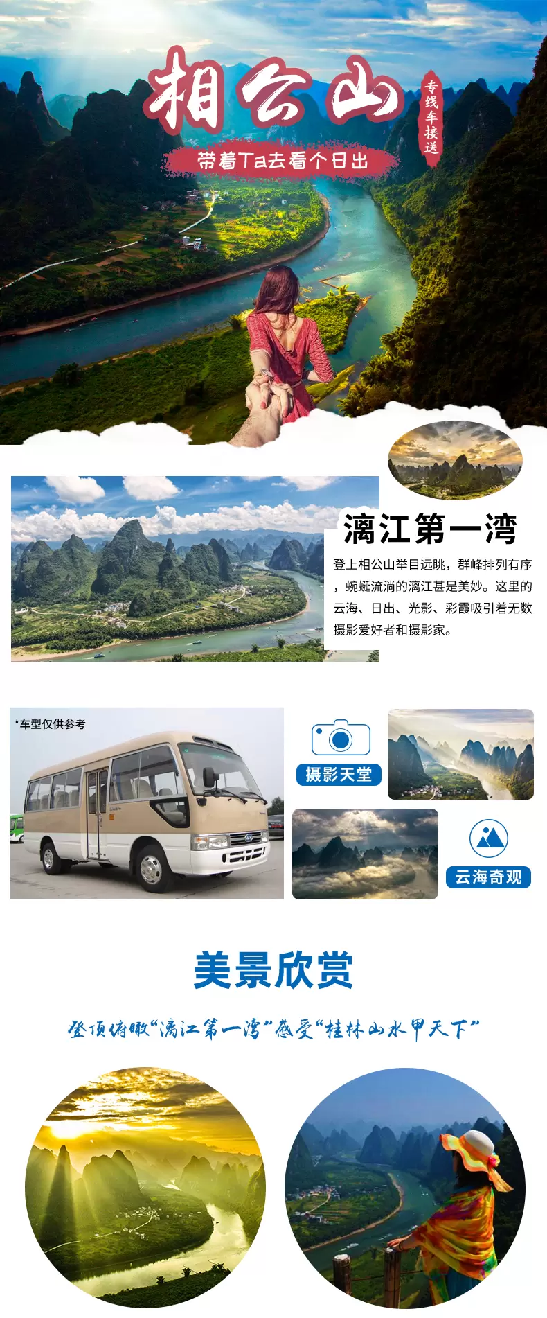 1、观日出/日落线为自然现象,受天气影响很大,是否能看到需要看当天的天气情况,如不能观赏到可以观赏漓江美景。