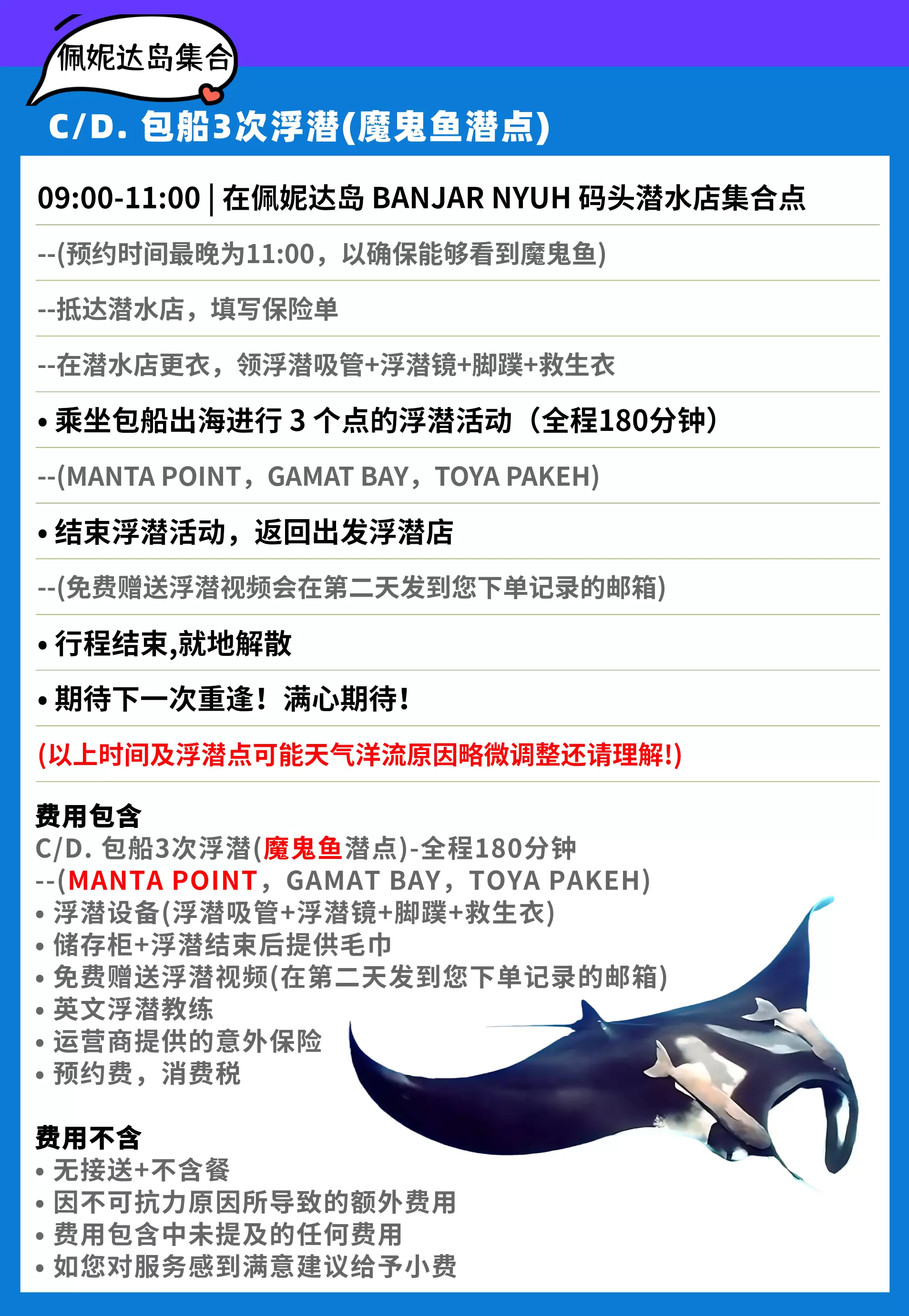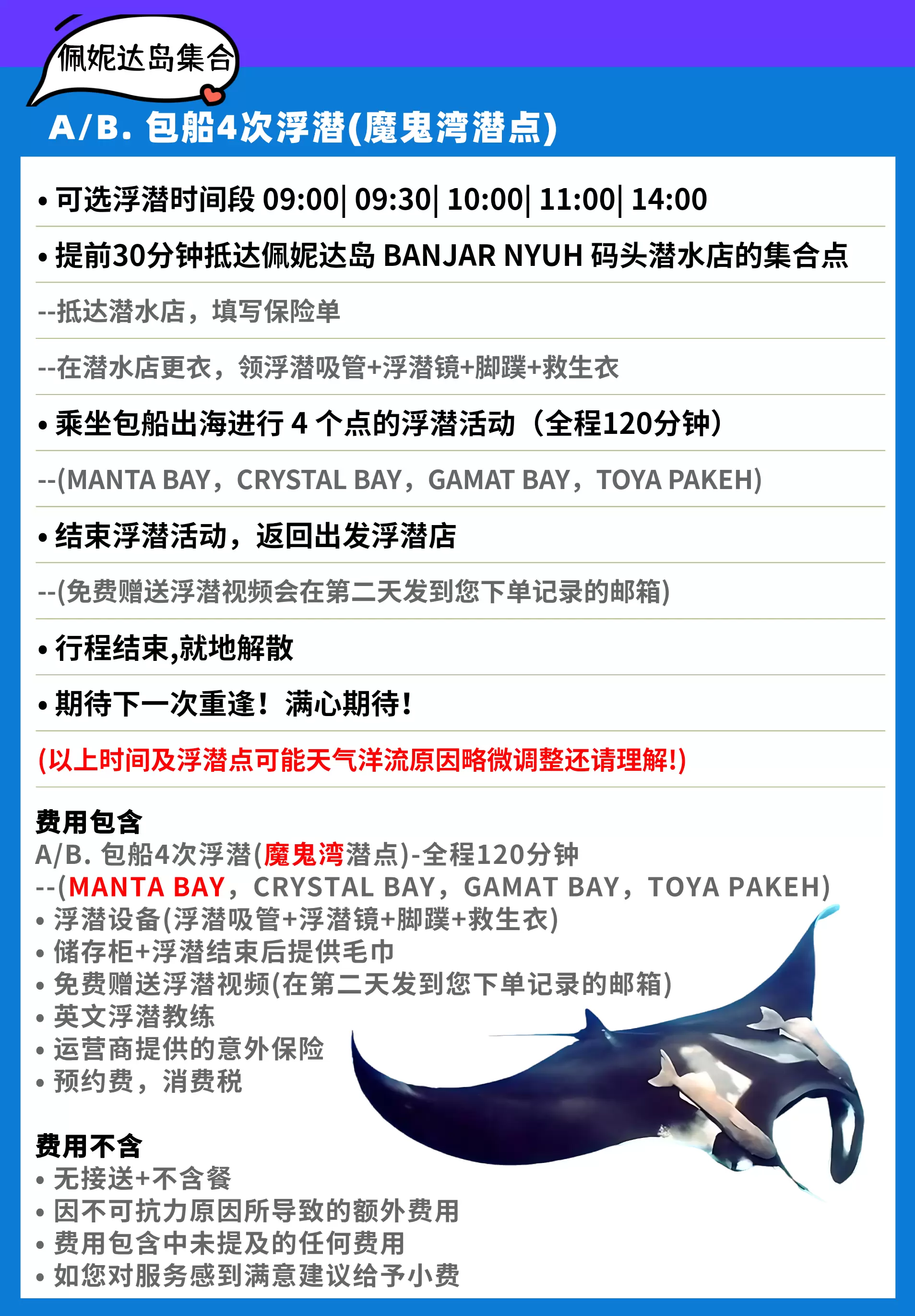 包船浮潜 佩妮达岛【可选 魔鬼鱼湾 或 魔鬼鱼点 浮潜点】
