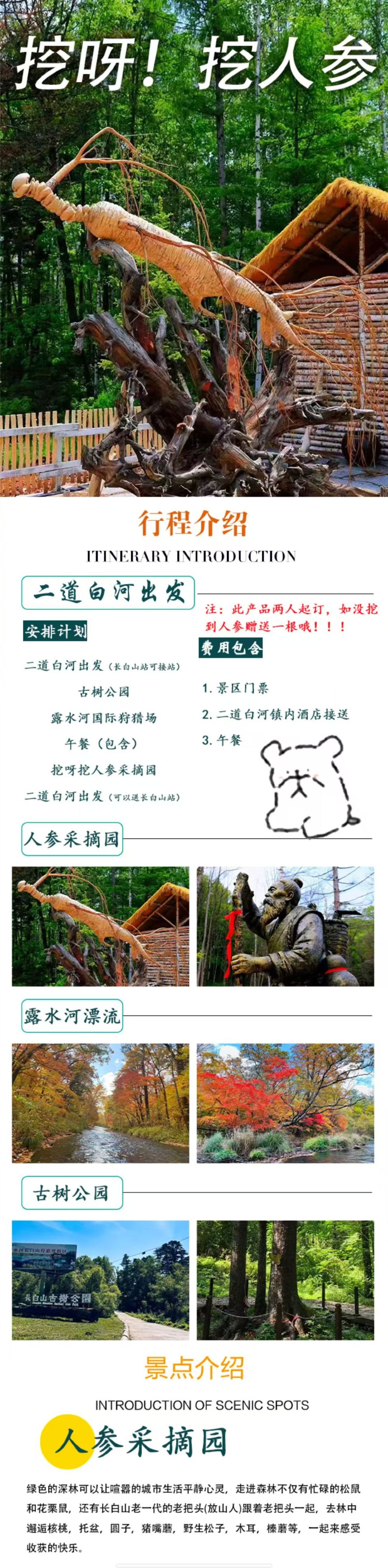 二道白河起止|两人起订|露水河国际狩猎场+挖人参一日游【天然的野生动物园组成壮观的神气的植物景观】