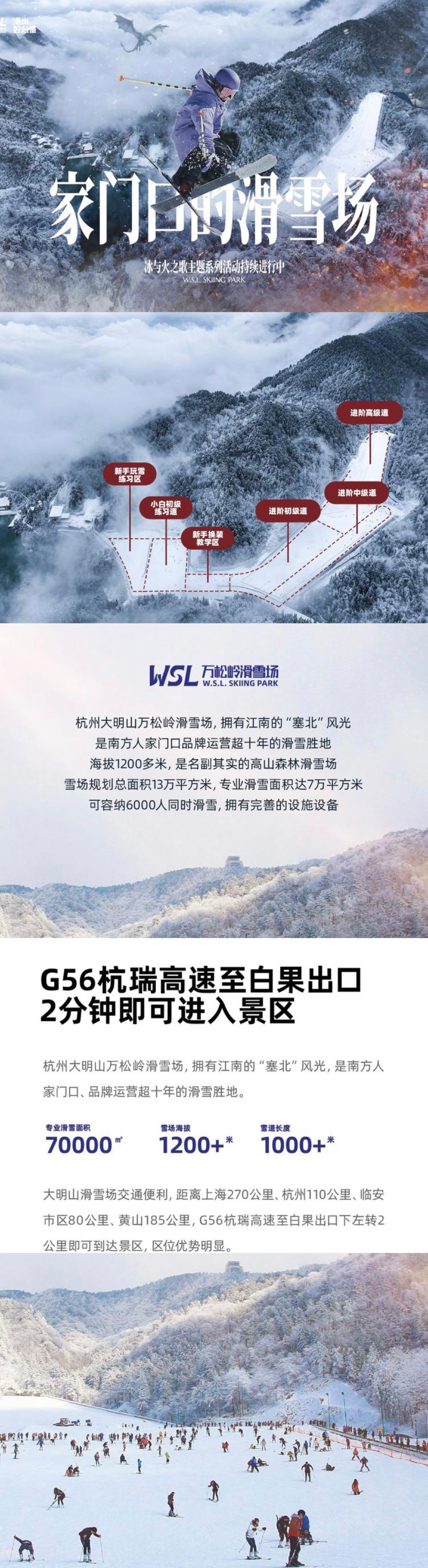 大明山滑雪场位于海拔 1200 多米的大明湖畔万松岭,是华东地区海拔高、面积大的赏雪、玩雪、滑雪乐园之一。雪场规划总面积 13 万平方米,可容纳 6000 人同时滑雪,能满足大量游客的滑雪需求。