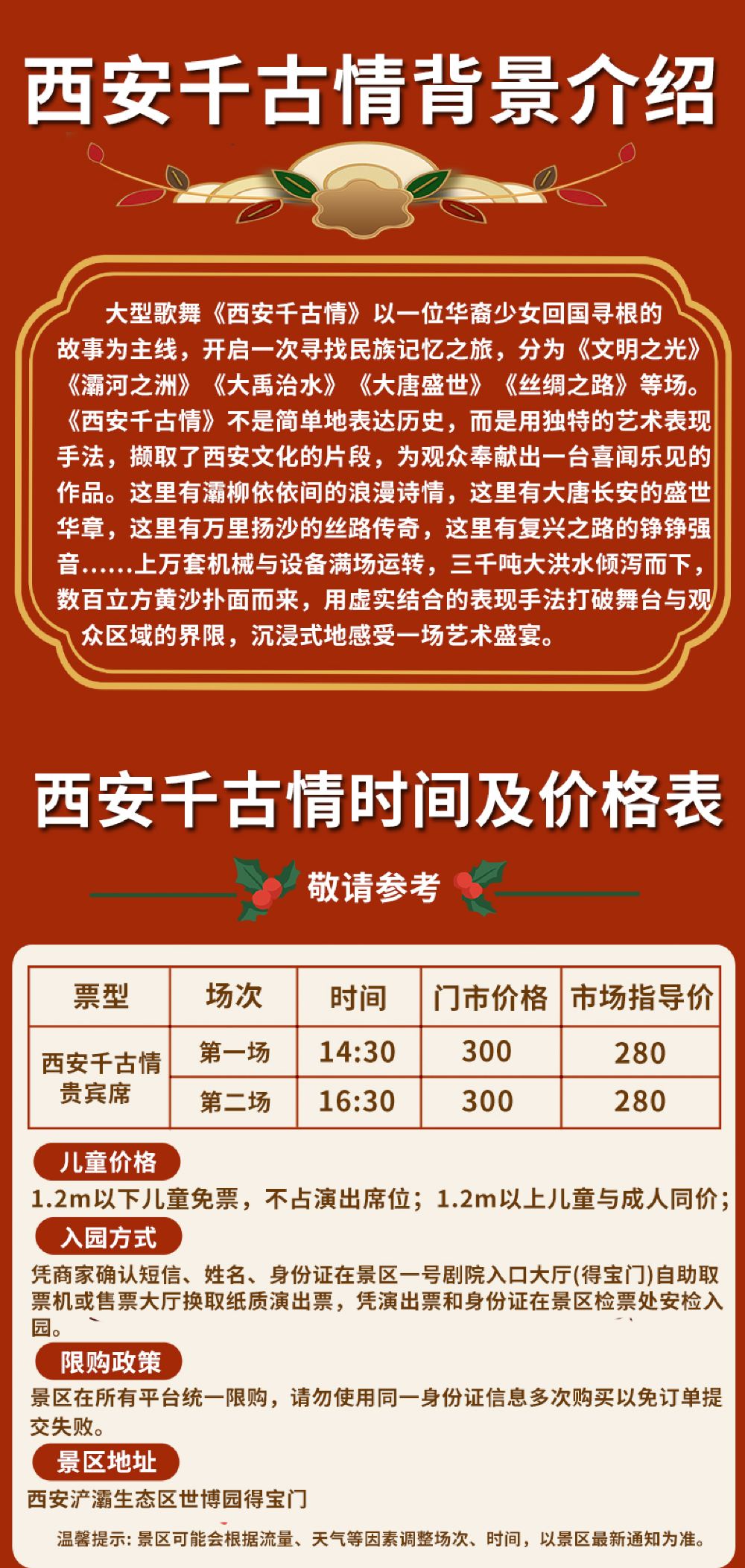 温馨提示:景区每天演出多场次,具体观看场次下单后商家客服会联系您沟通具体场次时间后出票,请保持手机畅通并接听电话,谢谢!