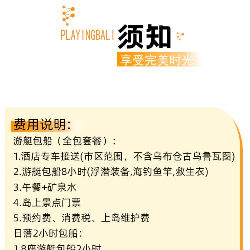 费用包含:巴厘岛市区酒店接送,往返船票,午餐,环岛游专车,税费