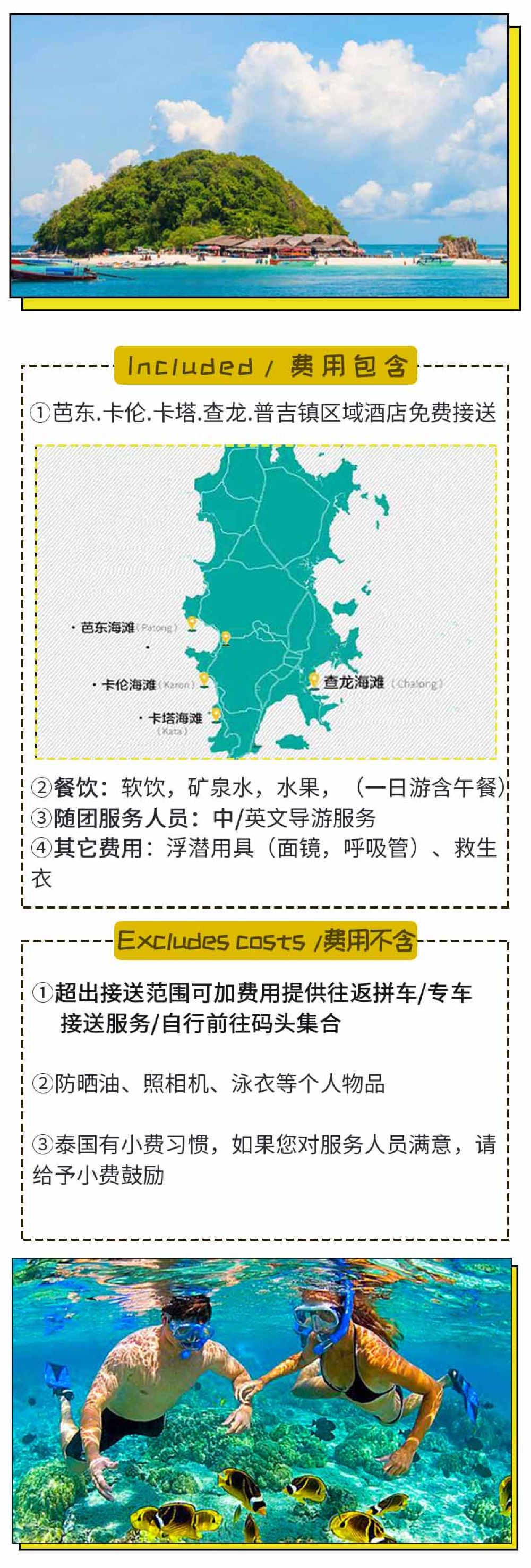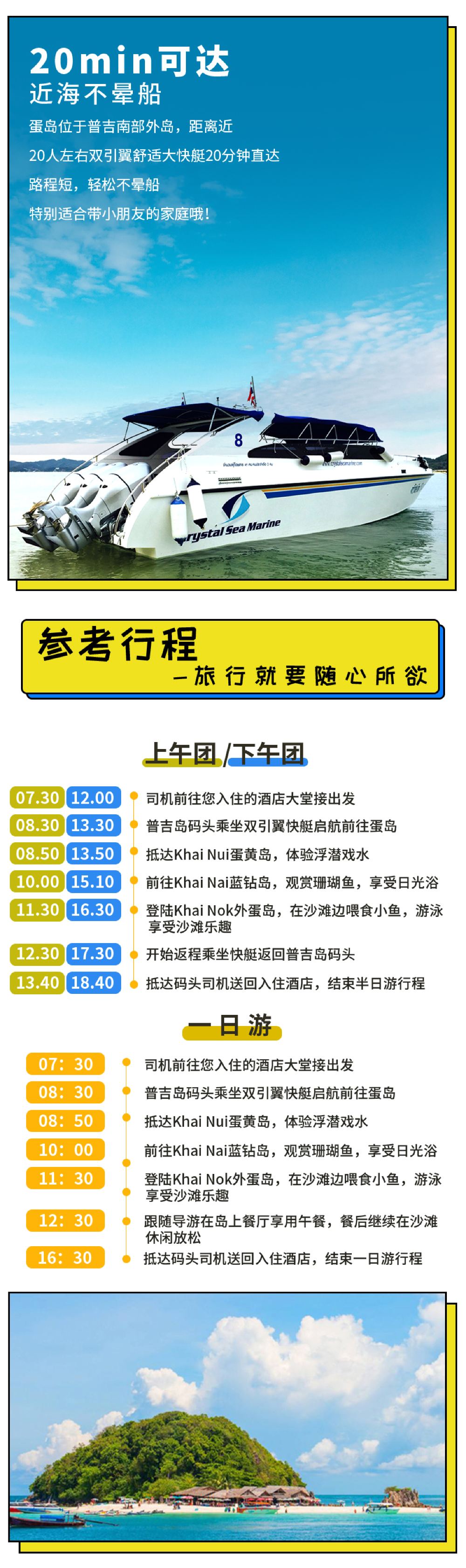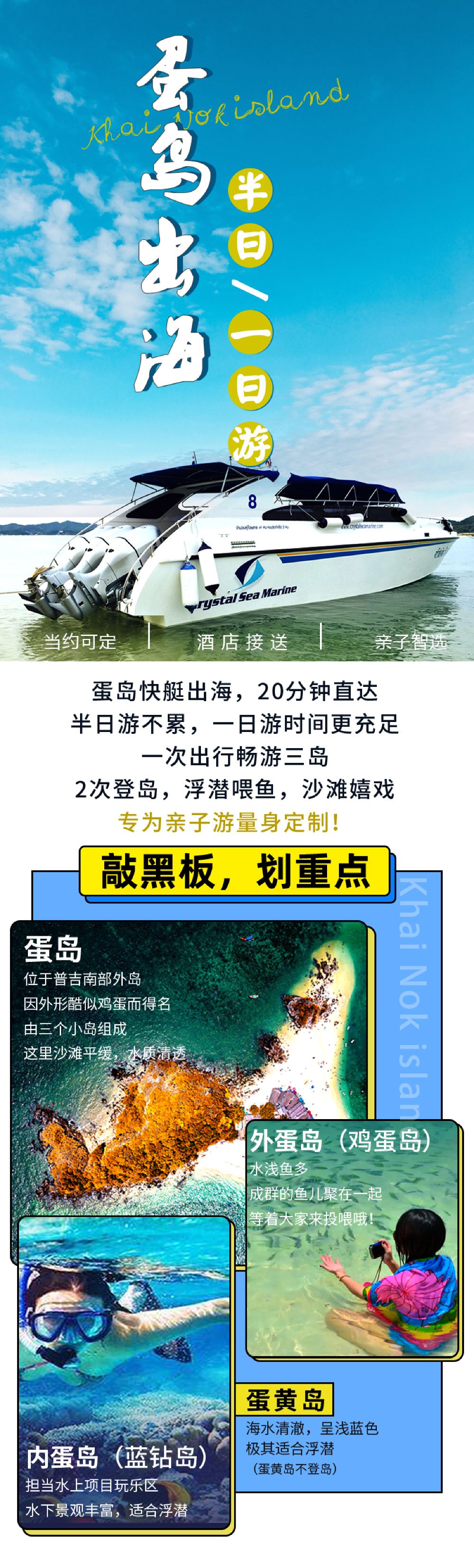 普吉鸡蛋岛半日游【路程短少晕船|游亲子3岛|中文服务【芭东、卡伦、卡塔,普吉镇地区酒店免费接送,快艇20分钟直达,适合带孩子出行的好去处】