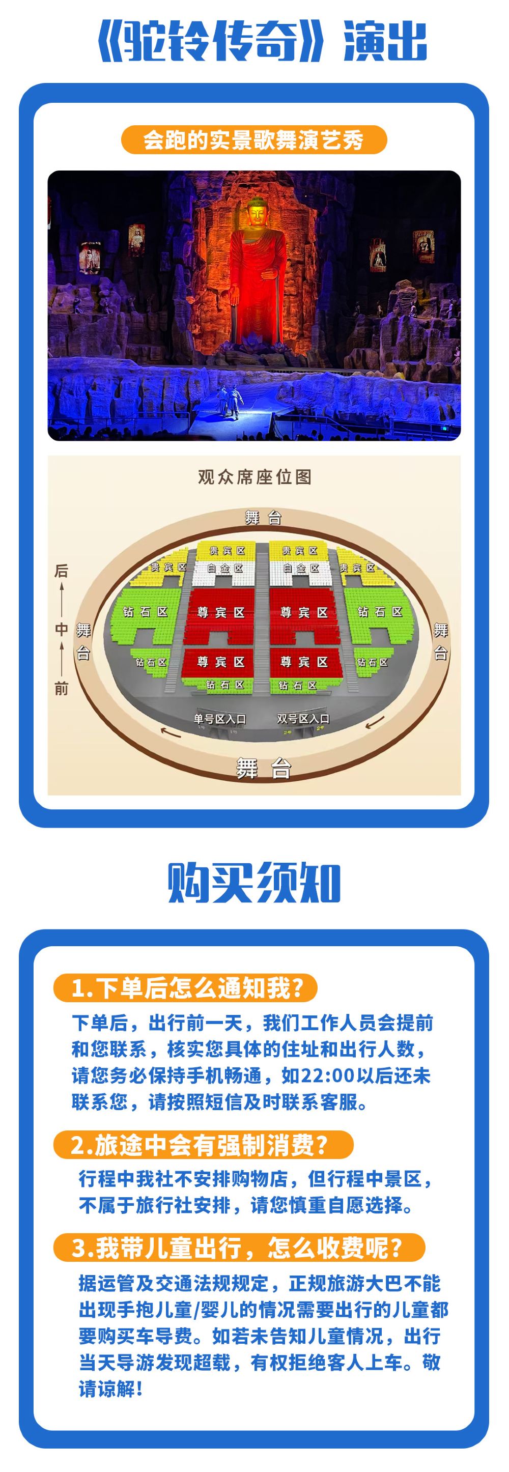 ①《驼铃传奇》演出时长70分钟左右,平日安排19:00场次,五一假期安排20:00场次(安排那个场次,具体以当天实际安排为准,请知悉!)