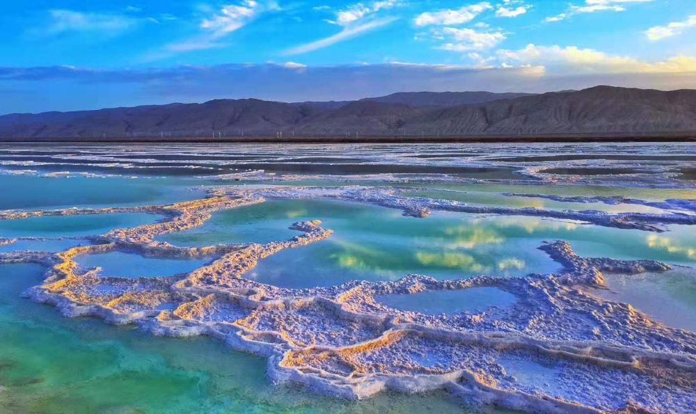 ▲ 走在盐滩上,看翡翠色湖水映着蓝天雪山,风过无波,仿佛踏入了西北的“天空之镜”秘境。