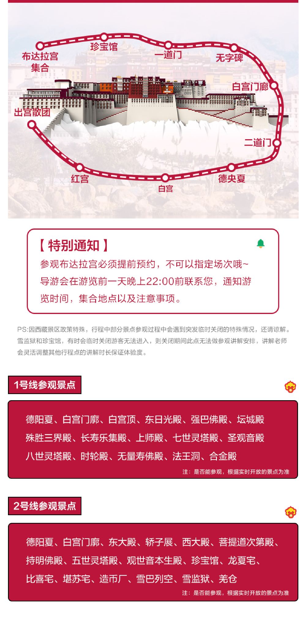 【入园时间2】因布宫景区的特殊性,入园时间由布达拉宫管理处随机分配 ,具体参观时间以导游通知为准,游客不可指定入园时间;