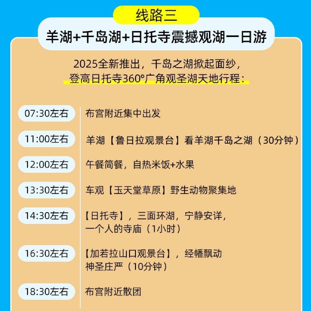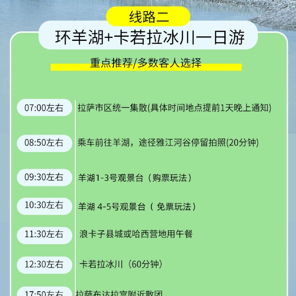 特别提示:国道349浪卡子县路段修路交通管制到10.23日(10.01-10.08正常通行)管制期间,羊湖卡若拉冰川线暂停发团国庆可定,新增羊湖日托寺供游客选择,原羊湖半日游可继续订购