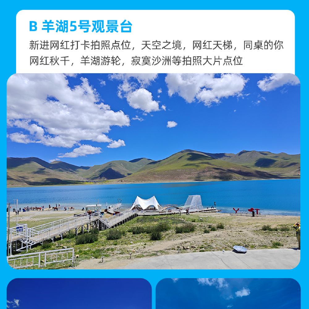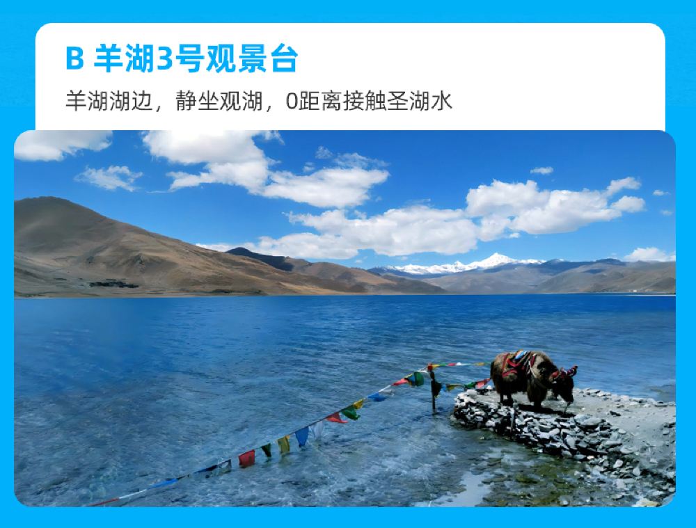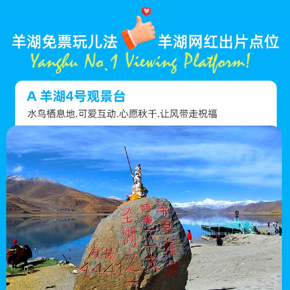 羊湖+卡若拉冰川:(4.5号观景台免票玩法):水鸟栖息地+网红打卡点;(1.3号观景台含票玩法):俯瞰羊湖S湾+湖边沉浸式观湖