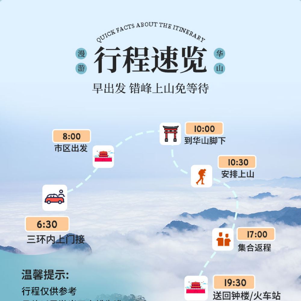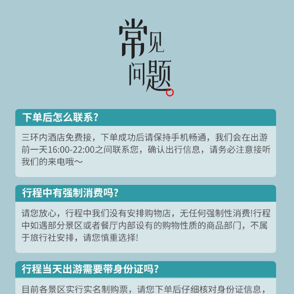 5.暑期旺季,节假日等我们会根据景区入园人流情况提前1-2小时左右出发,具体出发时间提前一天以工作人员通知为准哦。暑期,节假日等排队情况严重,我社不保证入园时间,请知晓!