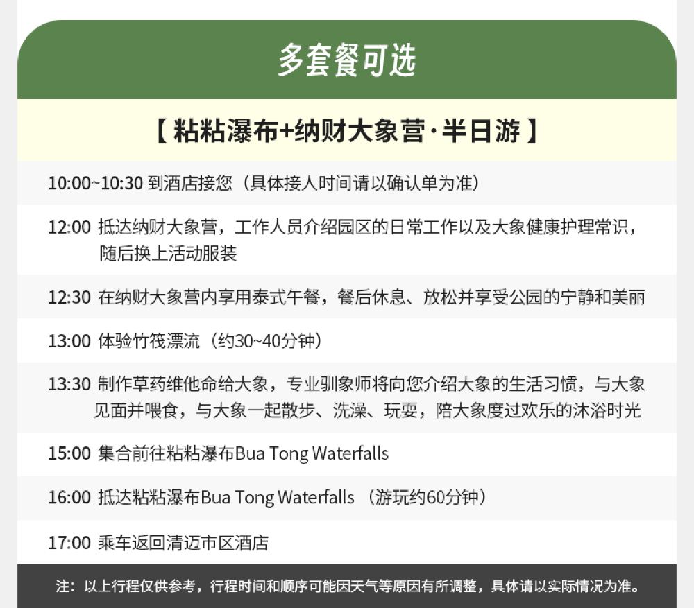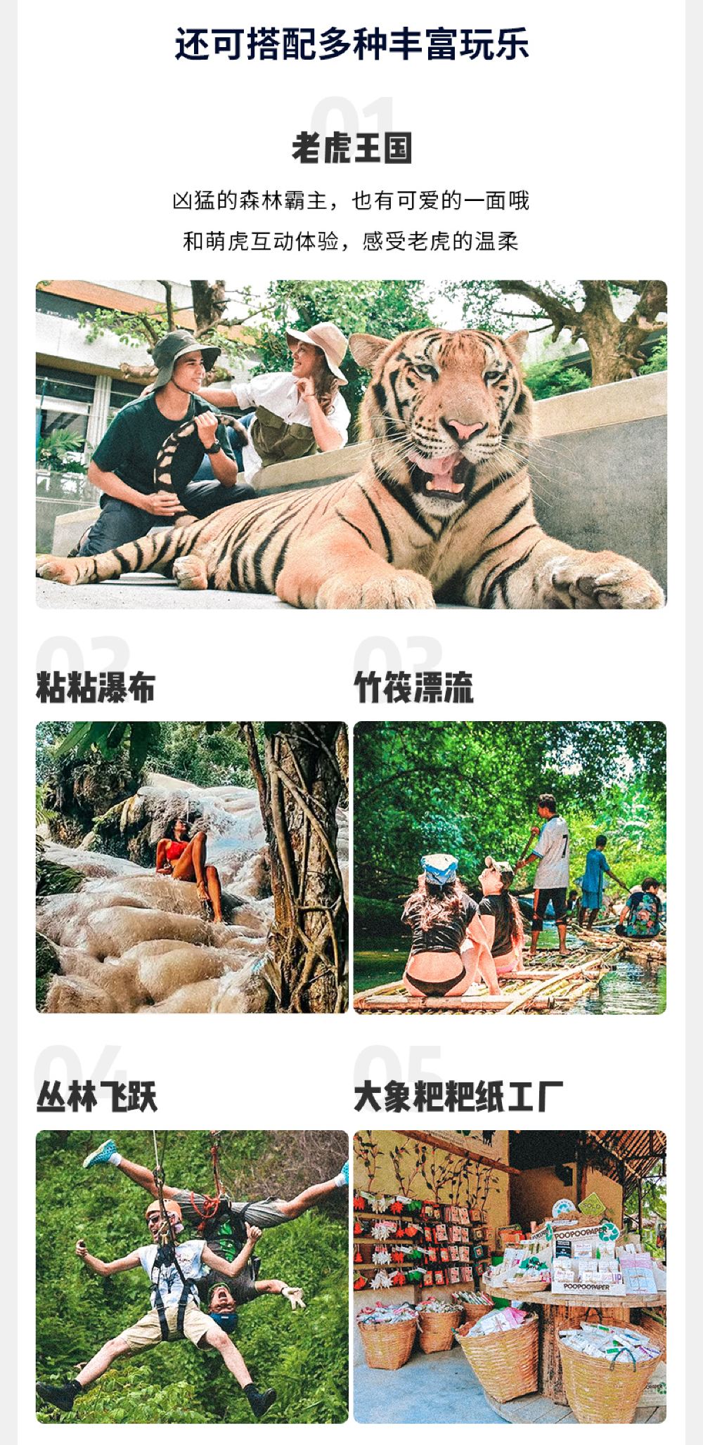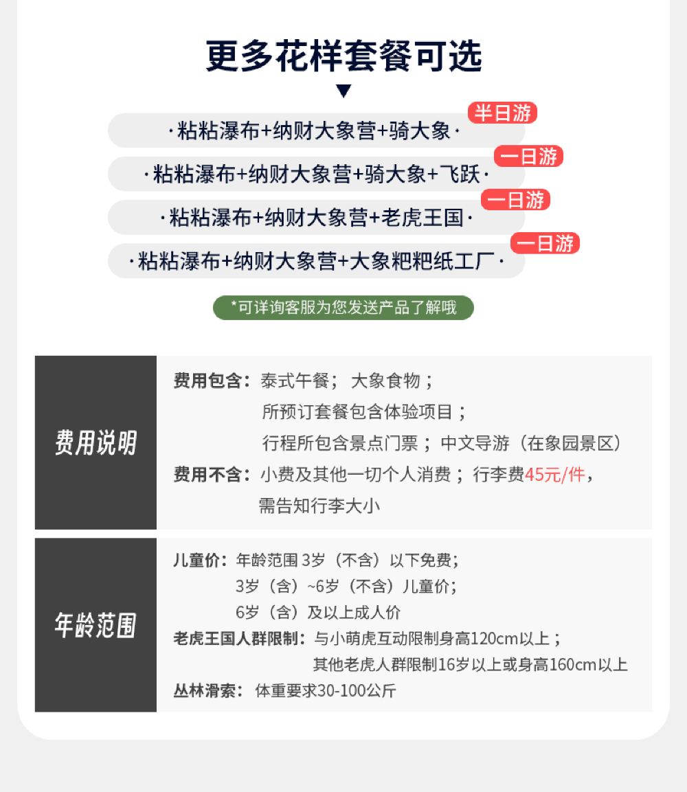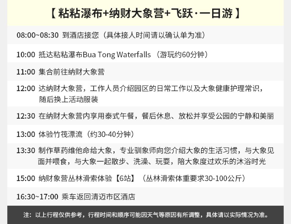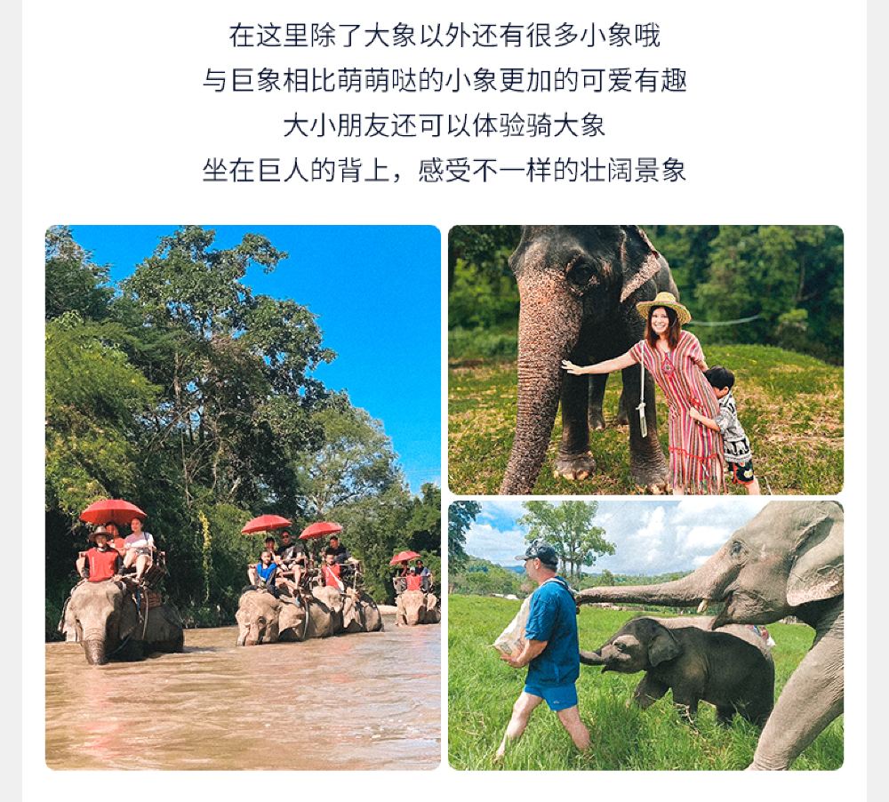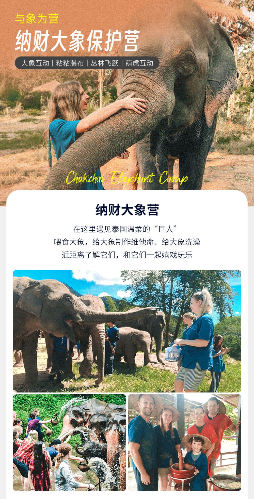 清迈纳财大象营+粘粘瀑布一日游 骑大象/竹筏漂流 含餐含接送【与象亲密互动:在纳财大象营,喂养大象、陪小象玩耍、深入了解大象生活,收获独特体验。】