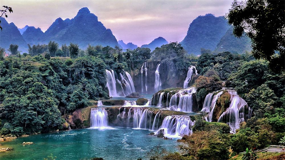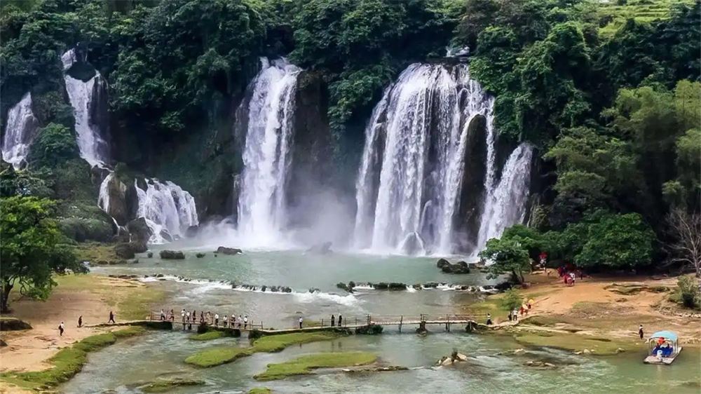 作为亚洲第一、世界第四的跨国大瀑布,德天瀑布横跨中越两国。瀑布从纵深 60 米的断崖上飞泻而下,形成三级跌落,层层叠叠,水势激荡,飞珠溅玉,声如雷鸣。