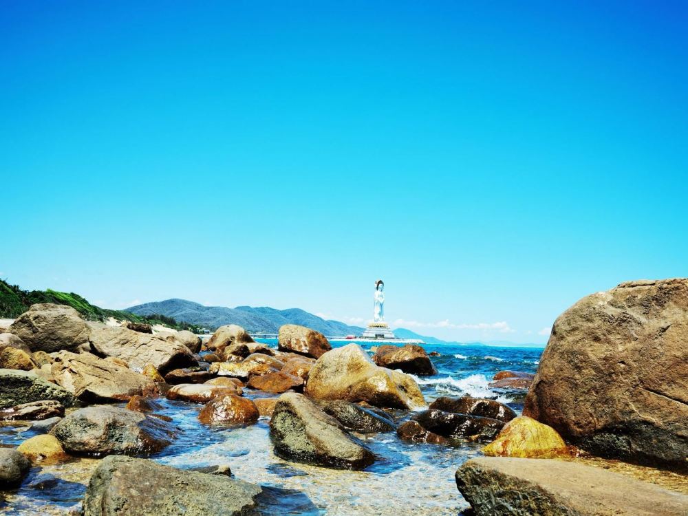 ▲ 南山海上观音是座108米高的观音菩萨圣像,位于南山寺前的海上金刚洲(观音岛)上,其圣象为正观音的一体化三尊造型,脚踏一百零八瓣莲花宝座,宝相庄严雄伟。南山海上观音是三亚著名的佛教建筑,也是著名的祈福胜地。