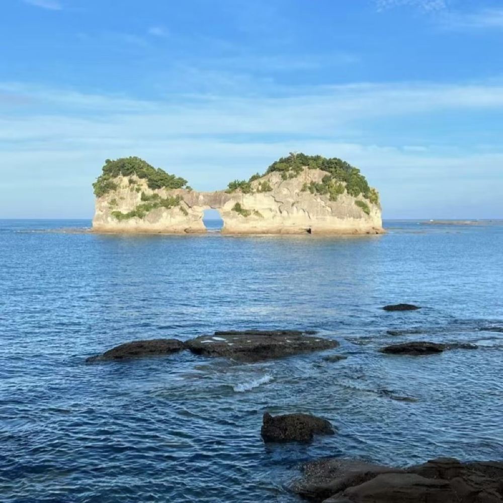 ▲ ▼柯南同款-円月岛(约30分钟) 一座孤独矗立在海上的圆形小岛,因为中央自然形成了一个圆洞而得名。海天一色中,这枚镂空的“石之月”静静漂浮,如同神明遗落在人间的秘宝。每天傍晚,夕阳正好穿过岛中心的圆洞,海面被镀上一层金色,宛如奇迹上演。那一刻,连时间似乎也慢了下来,只想屏息凝视,把这片光影奇景永远刻进心底。 17:00丨返程 返回大阪市区,愉快地结束当天的行程!
