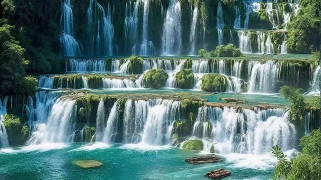 乘竹筏冲进瀑布群,水花狂舞溅湿全身,超解压!左边中国绿野,右边越南山色,手机信号秒切换,朋友圈定位都懵圈~雨季来更震撼,水势汹涌如万马奔腾!广西崇左自驾直达,快来体验“一脚踏两国”的疯狂!