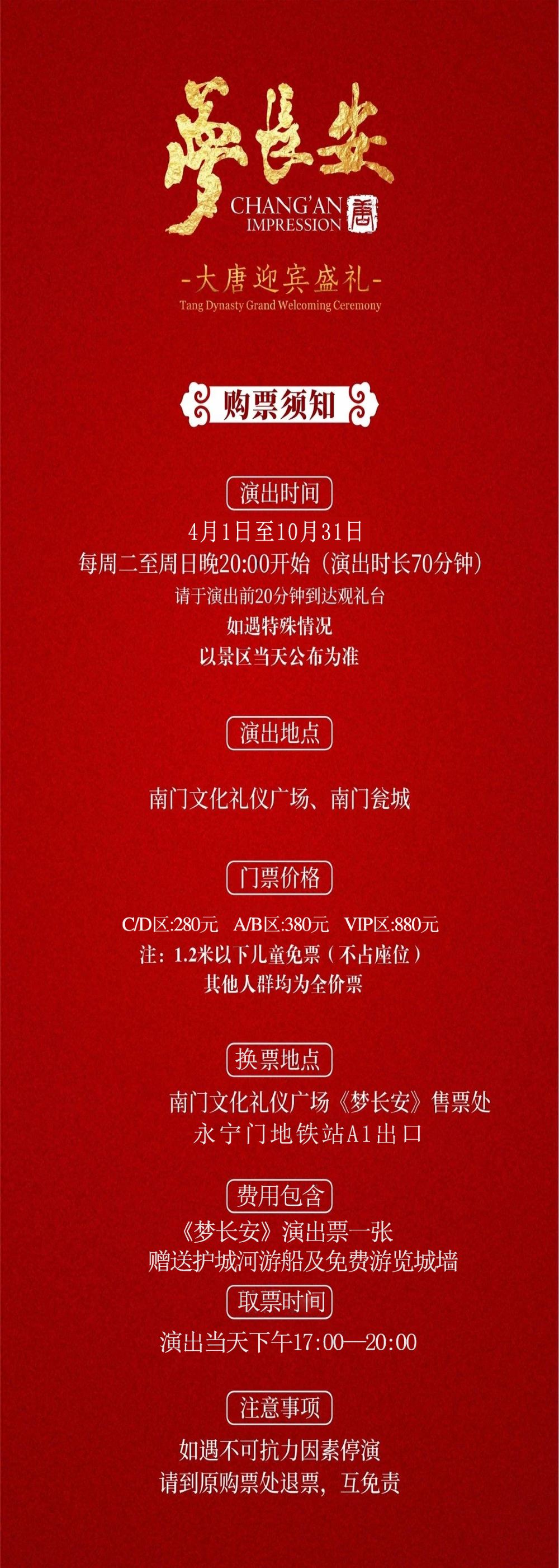 行程时间仅供参考,演出晚上20:00开始,请当天根据自己行程安排时间自行前往永宁门广场观看。凭《梦长安》演出票可免费登览西安城墙。 城墙闭园时间为:22:00(21:30清场)