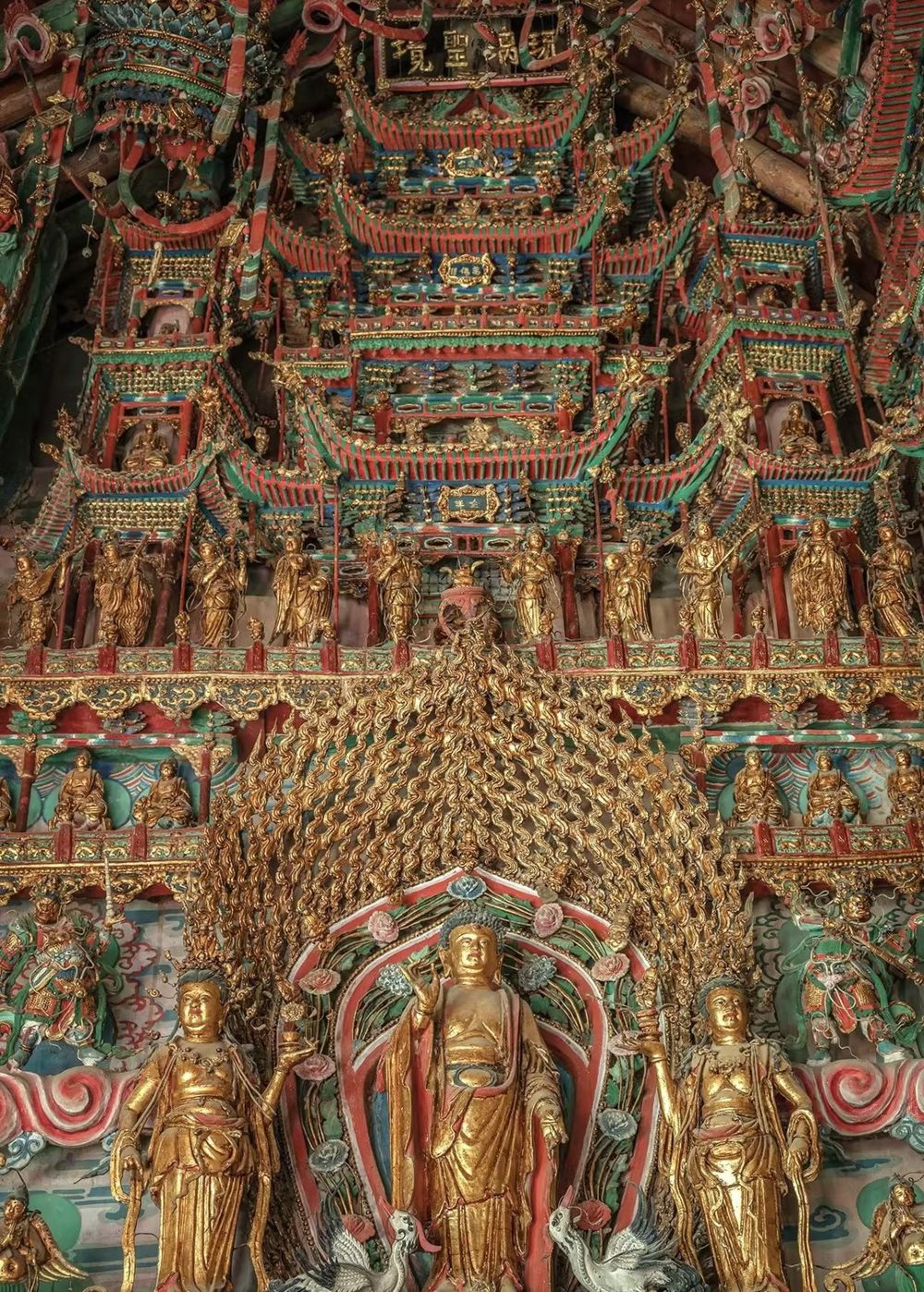 ▲ 小西天,原名千佛庵,由东明禅师始建于明崇祯二年(1629年),后因“重门”门额题有“道入西天”,且为区别于城南的明代寺院“大西天”,而更名为小西天。大雄宝殿是小西天的精华所在,为悬山顶式建筑,上覆琉璃瓦。殿内有上千尊明代彩塑,以五个世界佛为主题依次展开,除佛坛上的5尊主像外,墙壁、檩柱甚至屋椽之上皆有彩塑,姿态各异,造型生动。无梁殿则采用纯砖石拱券结构,不设梁柱,展现了明代高超的建筑技艺。