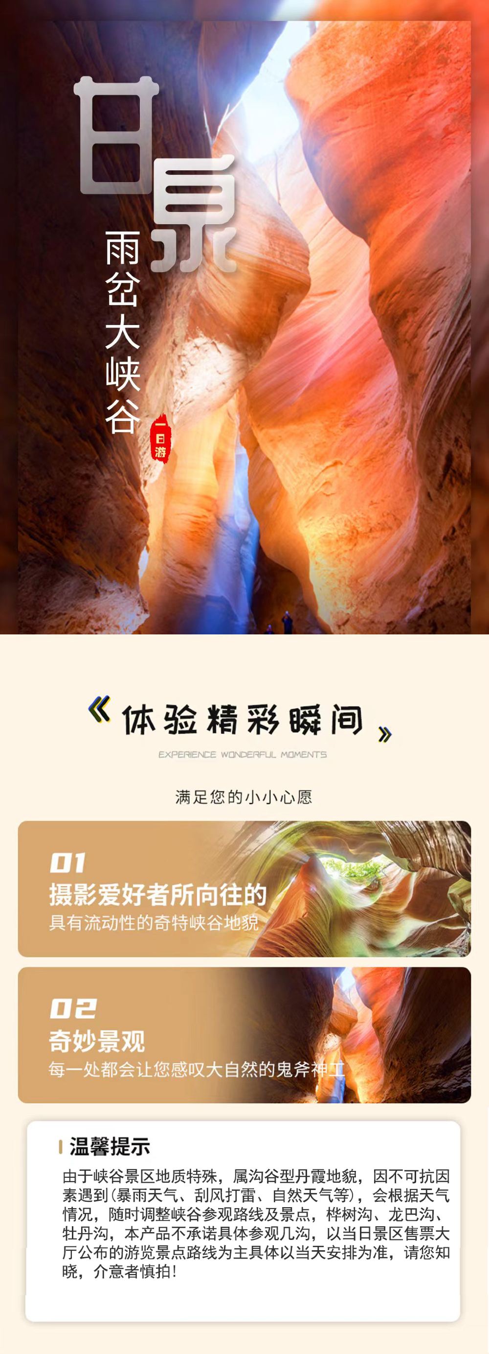 由于峡谷景区地质特殊,属沟谷型丹霞地貌,因不可抗因素遇到(暴雨天气、刮风打雷、自然天气等),会根据天气情况,随时调整峡谷参观路线及景点,以当日景区售票大厅公布的游览景点路线为主具体以当天安排为准,请您知晓。