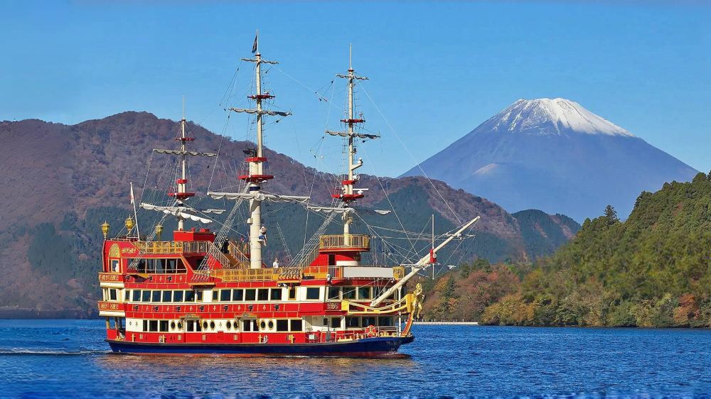 ▲ 箱根海贼船(自费1200日元)——加勒比之魂附体! 这船长得像杰克船长的座驾,但咱不抢宝藏,只抢风景!甲板吹风看富士山,湖面波光像撒了亮片,少女心直接炸裂