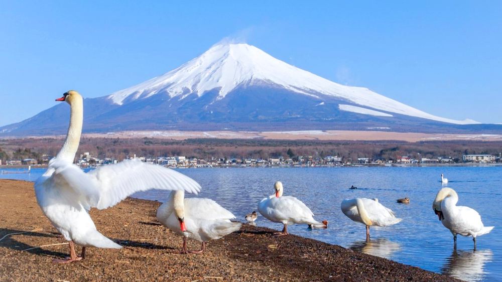 ▲ 山中湖白鸟滨——天鹅王子的选妃现场! 这儿的天鹅比人还会拍照!你喂食时它们会鞠躬、歪头、扑翅膀,妥妥的戏精! 隐藏机位:湖边芦苇丛蹲下拍,富士山刚好卡在天鹅翅膀中间。