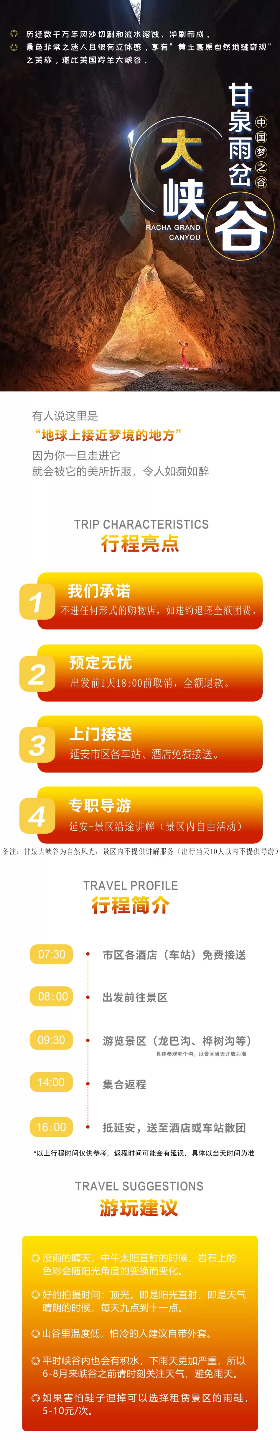 3.注意!!【淡季甘泉大峡谷开放2个沟,14点集合返程。如旺季景区开放3个沟,则延长游览1小时,15点集合返程,返回市区约17:30 请合理安排时间。】