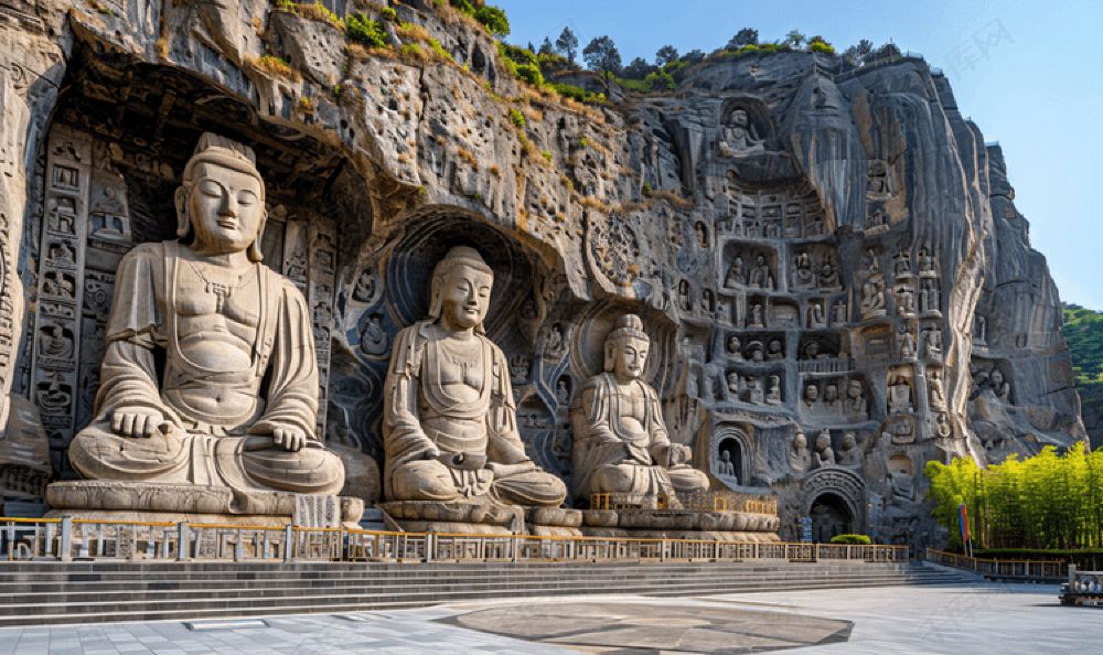 ▲ 龙门石窟位于河南省洛阳市,占地面积31.7平方千米, 为人文景观。 现存2345座佛龛,10万余尊造像,2800余块碑刻题记, 是世界上造像多、规模大的石刻艺术宝库,被联合国教科文组织评为“中国石刻艺术的高峰”,位居中国各大石窟之首。