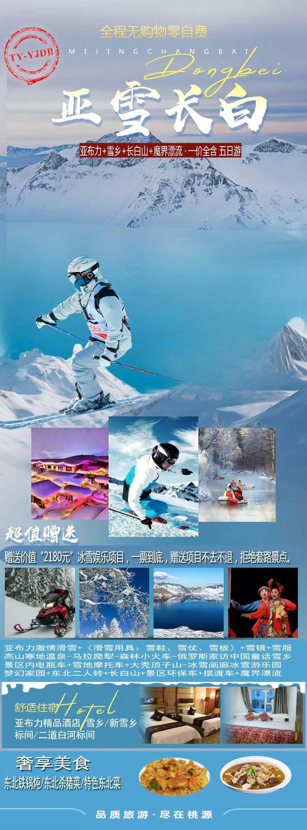 亚布力滑雪旅游度假区+中国雪乡+长白山景区+长白山魔界漂流五日游【一价全含,0自费0购物丨滑雪+漂流+航拍】