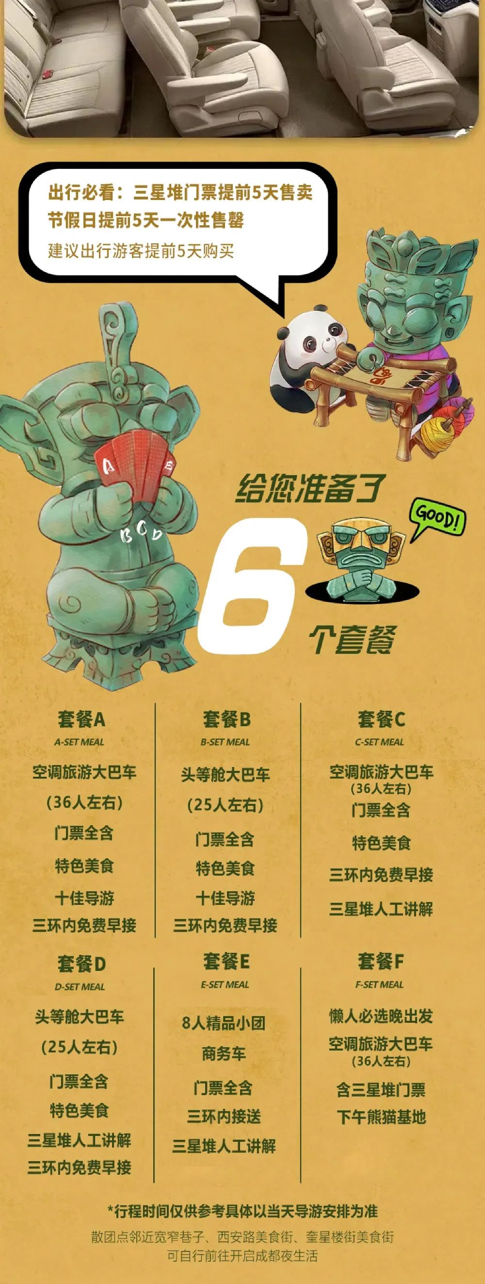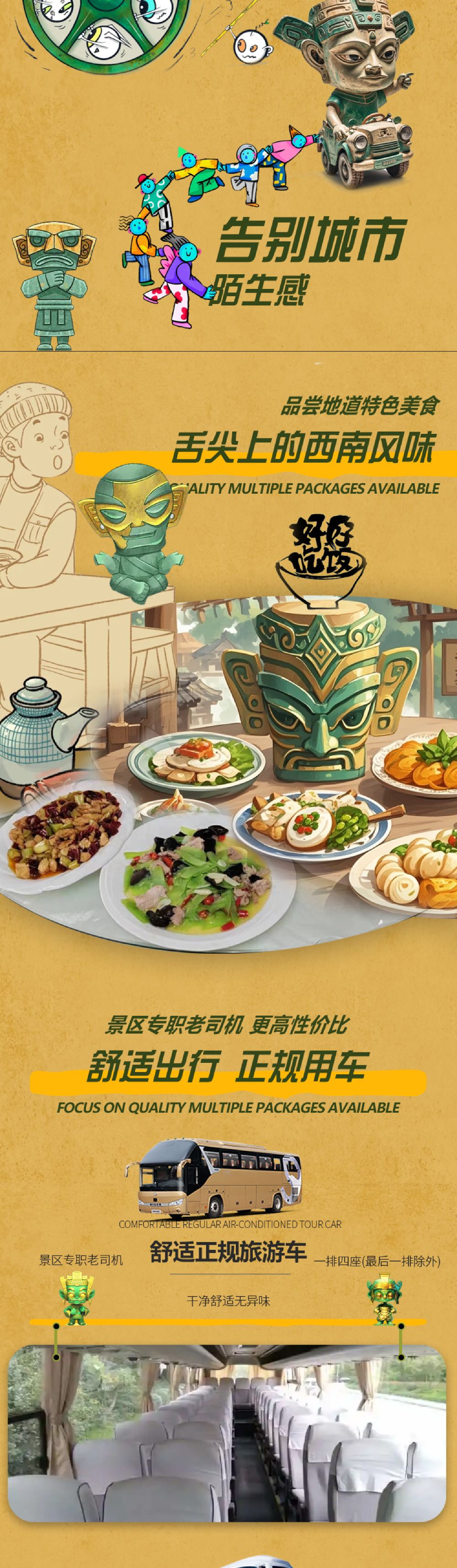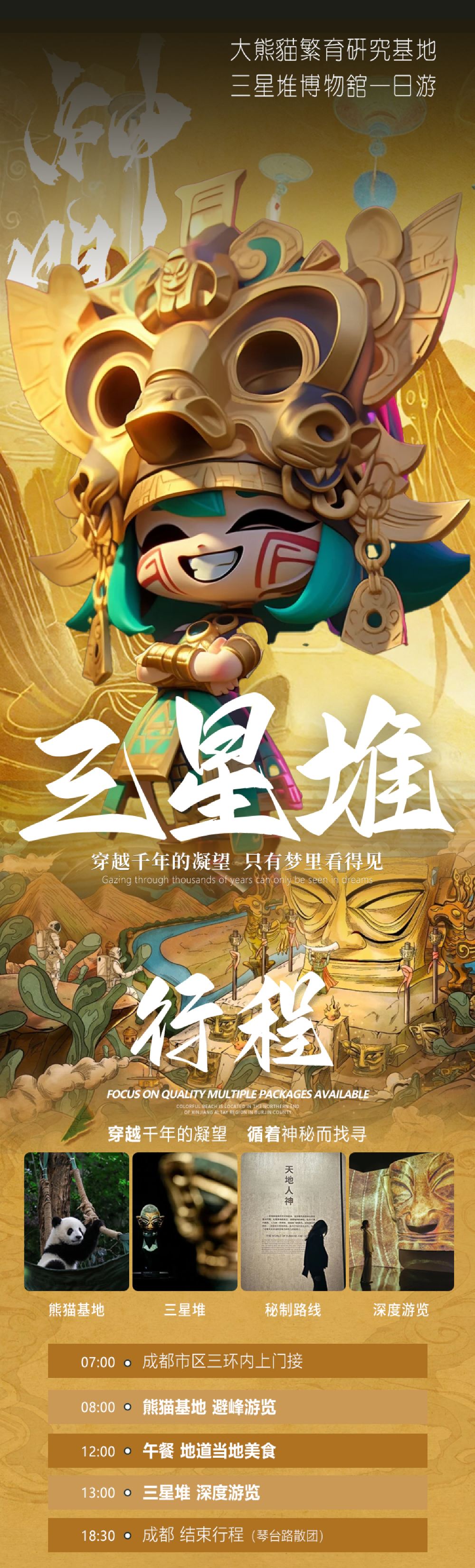 暑假、寒假或者五一国庆春节等国家法定节假日期间,三星堆门票将分时段售票,若白天场门票售罄,我们旅行社工作人员将为您更改为游览【三星堆下午18点场】万分感谢您的理解。
