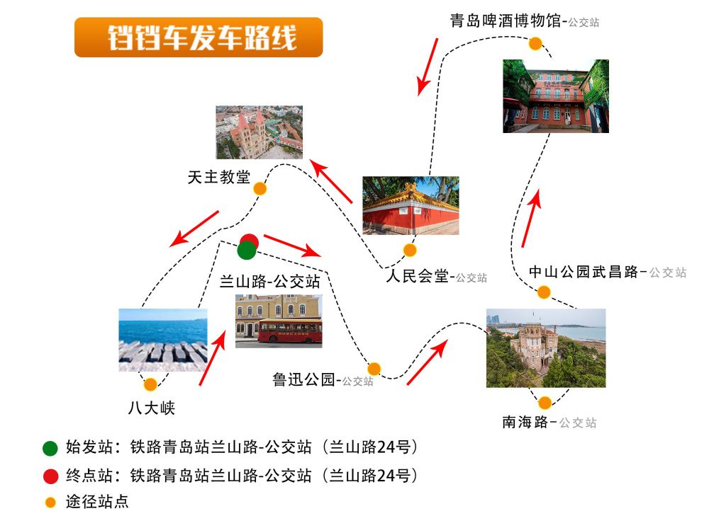 ▲ 铛铛车停靠站点:【兰山路站】-【鲁迅公园站】-【南海路站】-【中山公园武昌路站】-【青岛啤酒博物馆站】-【人民会堂】-【湖北路中山路站】-【八大峡站】 【兰山路站】 可前往青岛火车站、栈桥、德国建筑群 【鲁迅公园站】 可前往鲁迅公园、海军博物馆、小青岛、海底世界、小鱼山、康有为故居 【南海路站】 可前往第一海水浴场、八大关 【中山公园武昌路站】 可前往中山公园、汇泉广场 【青岛啤酒博物馆站】 可前往青岛啤酒博物馆、台东步行街 【人民会堂】 可前往小鱼山、大学路、龙江路、信号山、童第