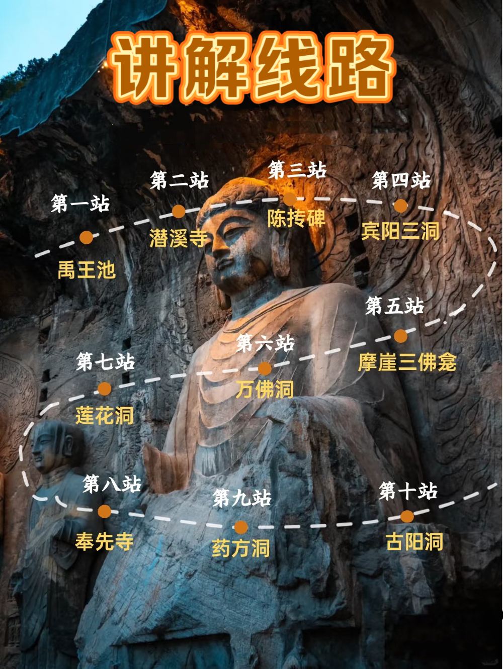 ▲ 这是龙门石窟的讲解线路图,核心信息与特点如下: 1. 线路设计:涵盖10个核心点位(禹王池、潜溪寺等),以环线串联龙门石窟经典洞窟与碑刻,适配游客游览动线; 2. 点位特色: ◦ 包含艺术价值高的洞窟(如宾阳三洞、万佛洞); ◦ 覆盖文化遗迹(陈抟碑)与自然景观(禹王池),兼顾观赏性与知识性; 3. 功能定位:为游客提供清晰的讲解导览路径,帮助高效游览石窟核心景观。 该线路是龙门石窟主流的精华游览路线,可串联多数必看景点。要不要我帮你整理一份各讲解点位的核心看点与游览时长建议?