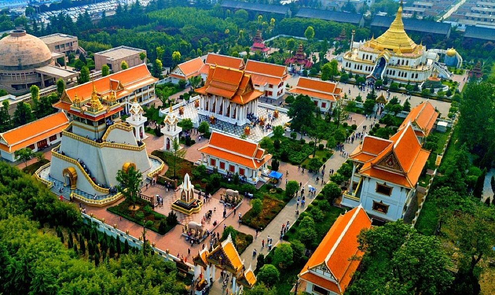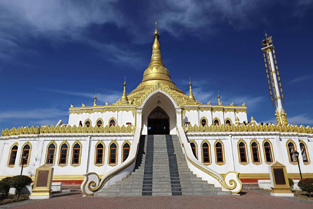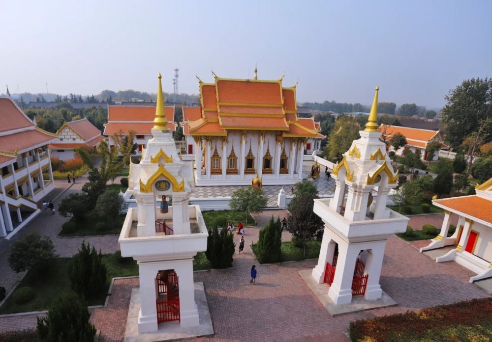 ▲ 白马寺的外国寺院包括印度、泰国、缅甸风格佛殿。印度佛殿仿桑奇大塔 1∶1 建造,有佛陀故事廊柱。泰国佛殿以曼谷大皇宫为蓝本,金顶雕龙,2014 年供奉释迦牟尼佛舍利。缅甸佛塔苑遵循缅甸传统风格,主门和围墙移植曼德勒皇宫样式,大金塔内供奉四尊释迦牟尼佛像。