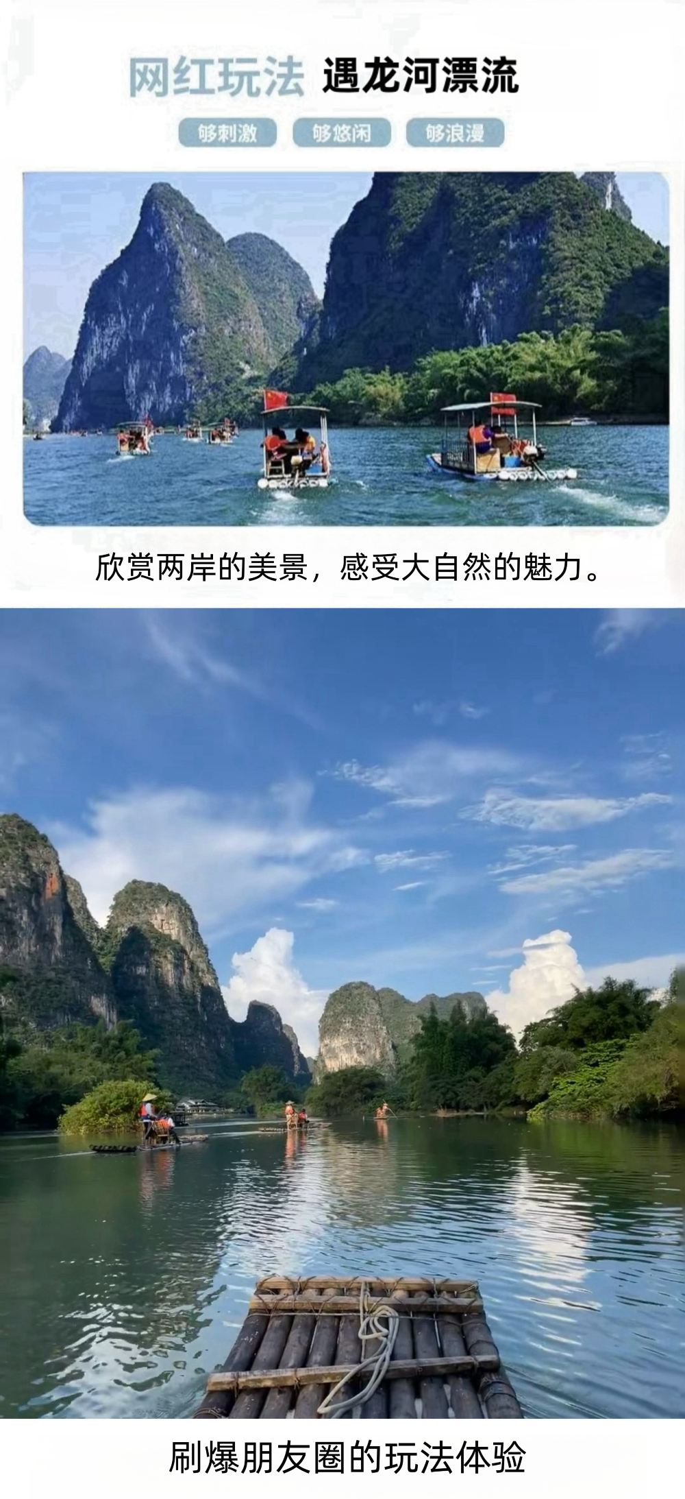 5、漂流时长仅为参考,筏工为遇龙河景区管控,实际竹筏漂游时长请以当天筏工划筏速度而决定。