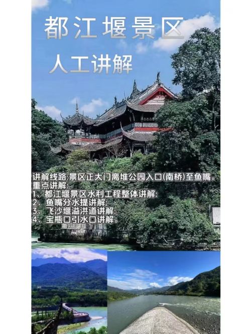 讲解线路:景区正大门离堆公园入口(南桥)至鱼嘴。重点讲解:1、都江堰景区水利工程整体讲解:2、鱼嘴分水提讲解;3、飞沙堰溢洪道讲解:4、宝瓶口引水口讲解。