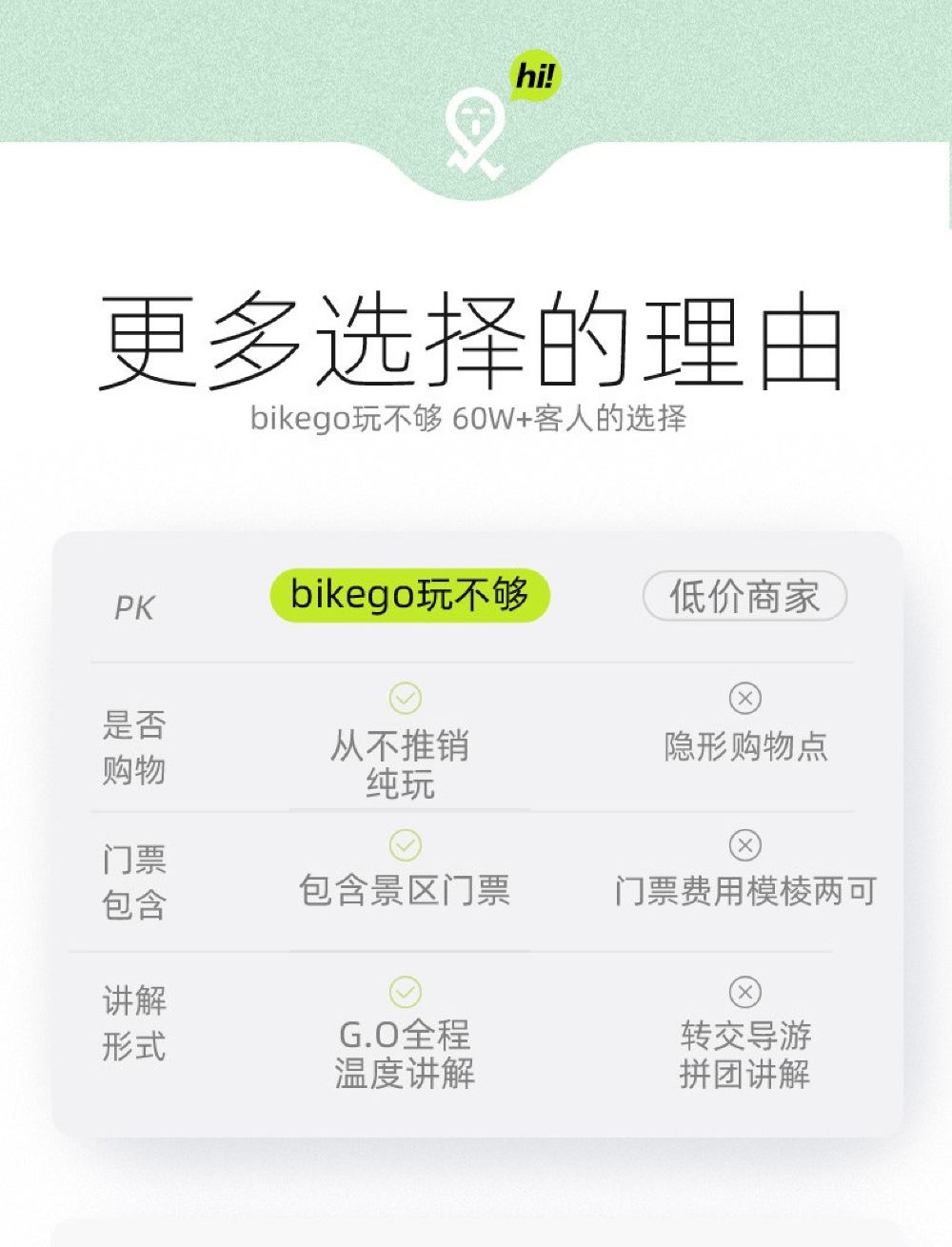 由于3人以下无法成团,为避免影响您的游玩,“bikego&大咖说” 工作人员会在出行前一天23:00前(出发地当地时间)通知您并全额退款或根据您需求帮您改期哦~