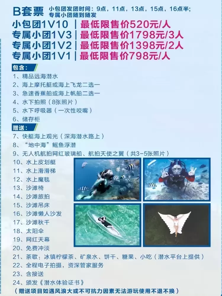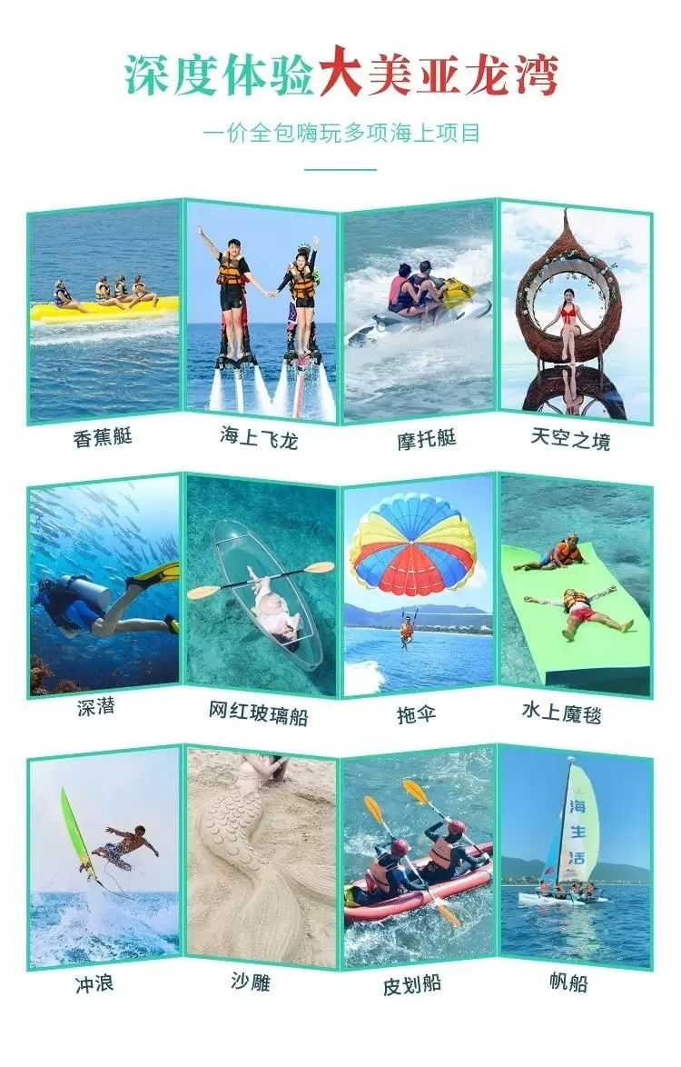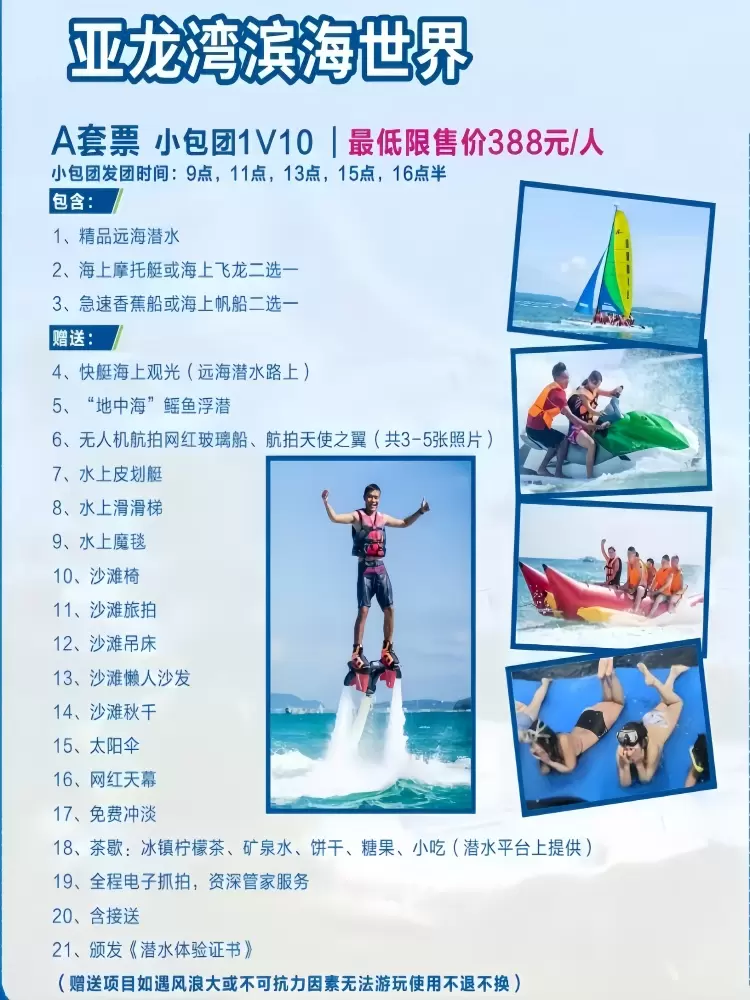三亚亚龙湾潜水一日游【摩托艇/海上飞龙+香蕉船/帆船+冲浪+午餐+接送】