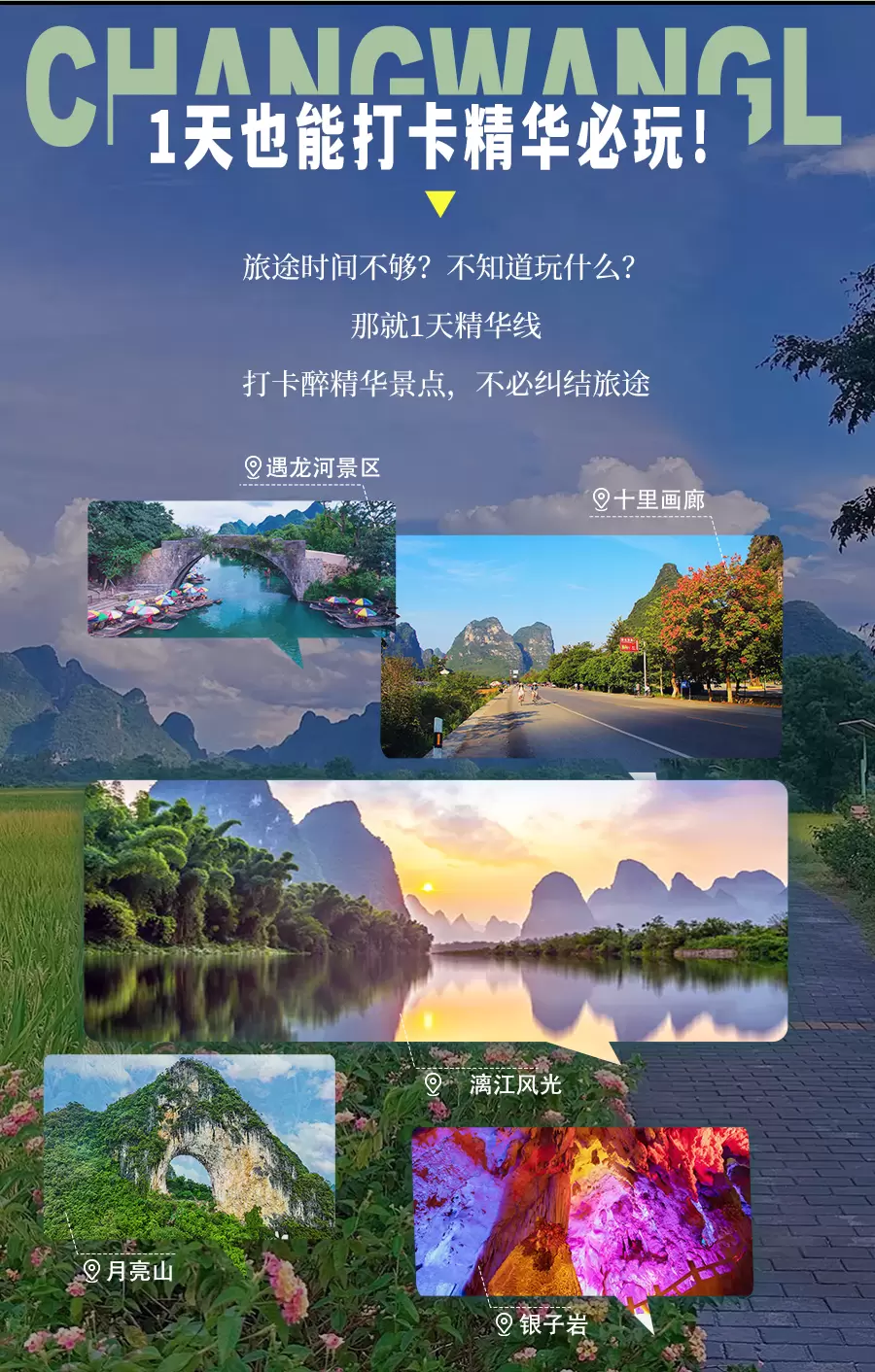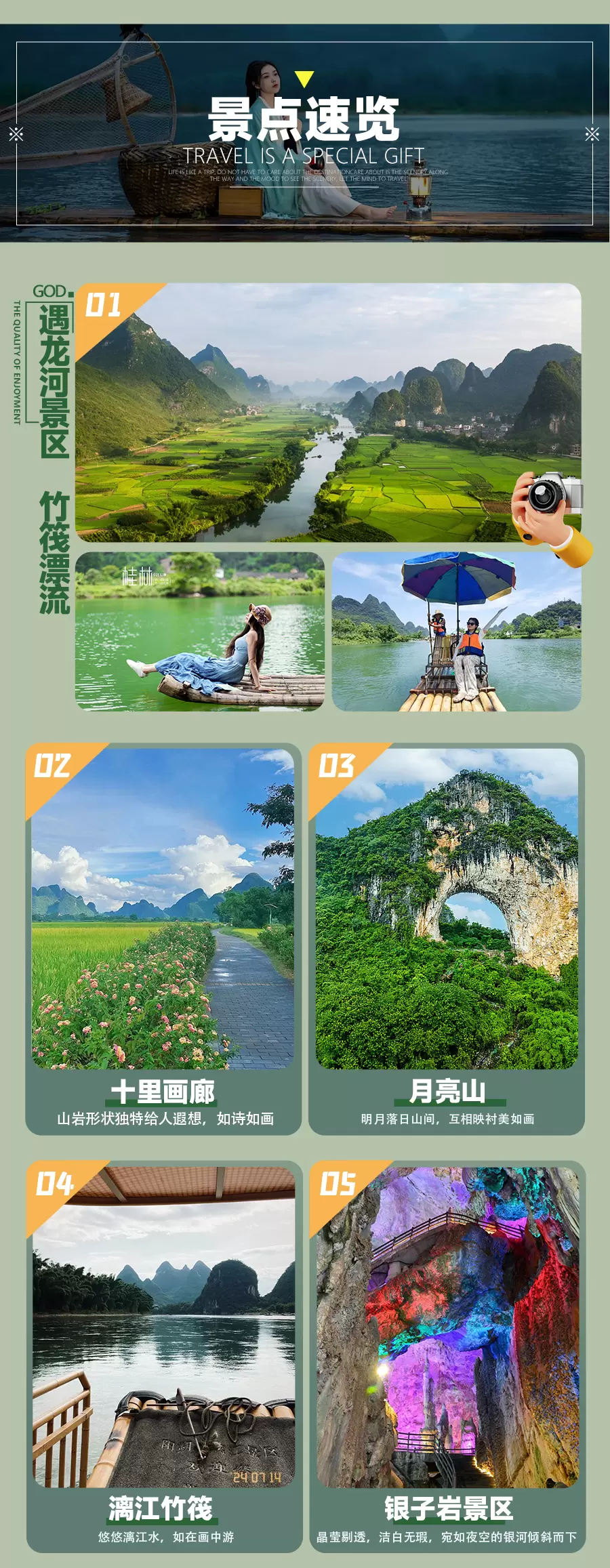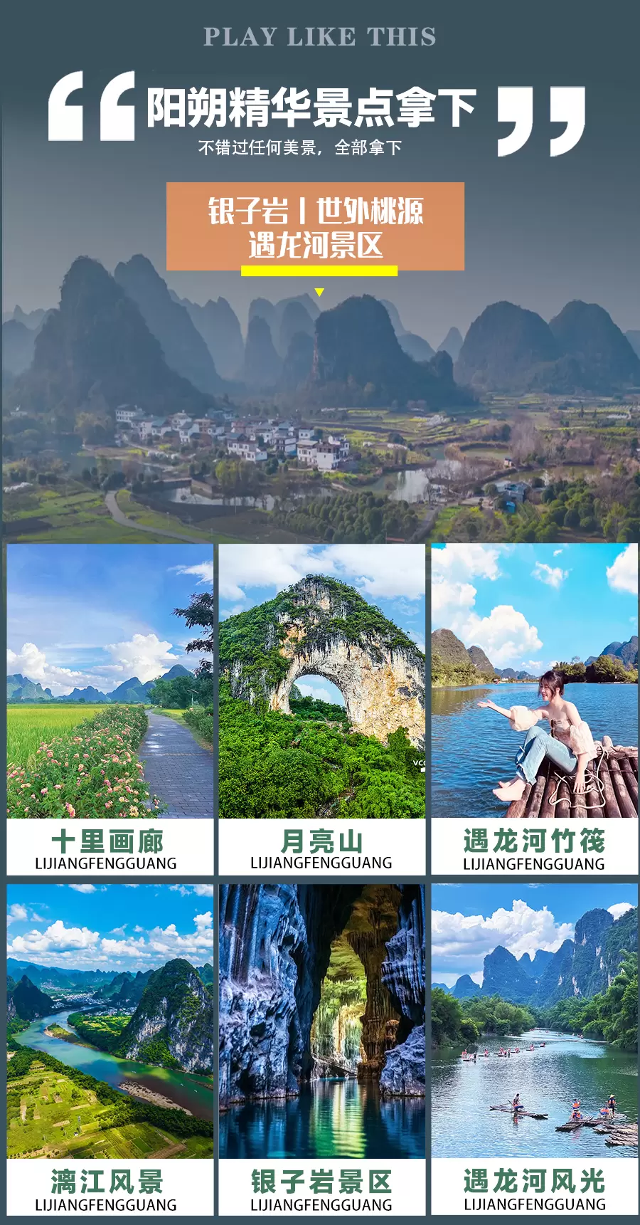 桂林漓江竹筏+遇龙河漂流+银子岩+十里画廊一日游丨阳朔纯玩+市区上门接+可阳朔出发