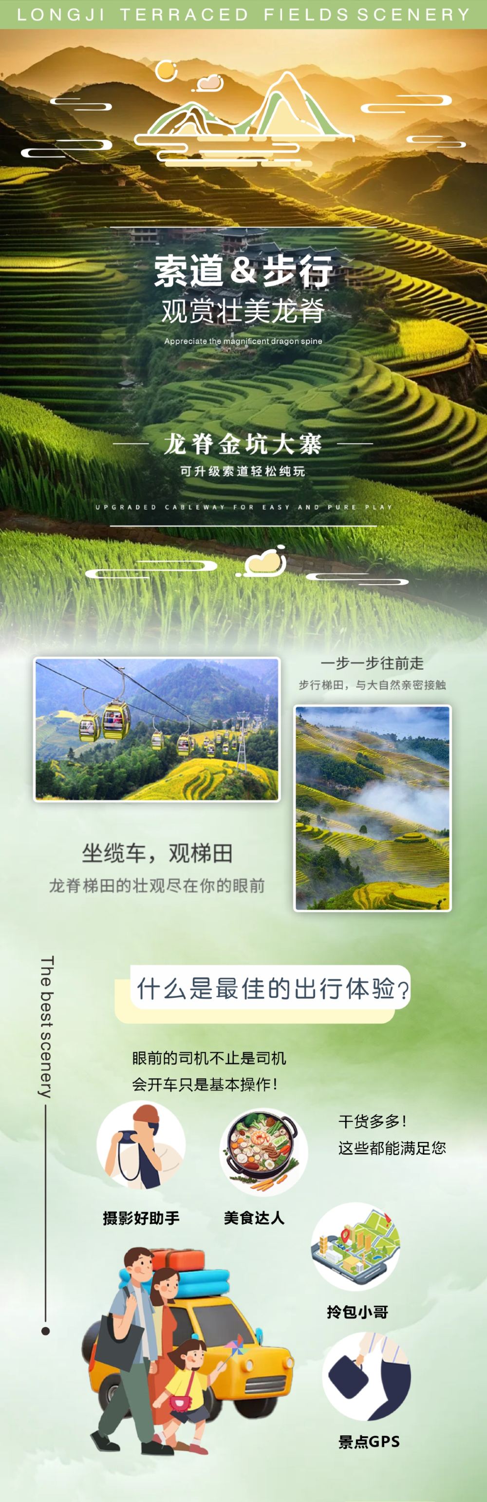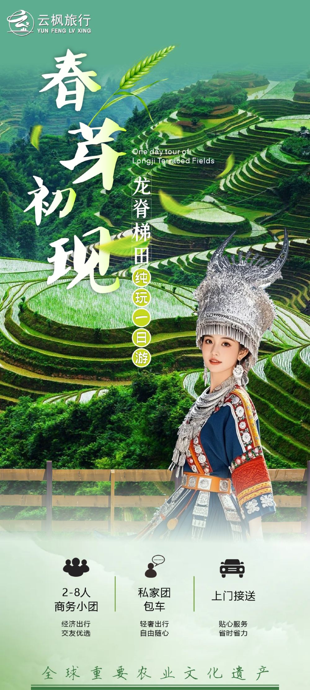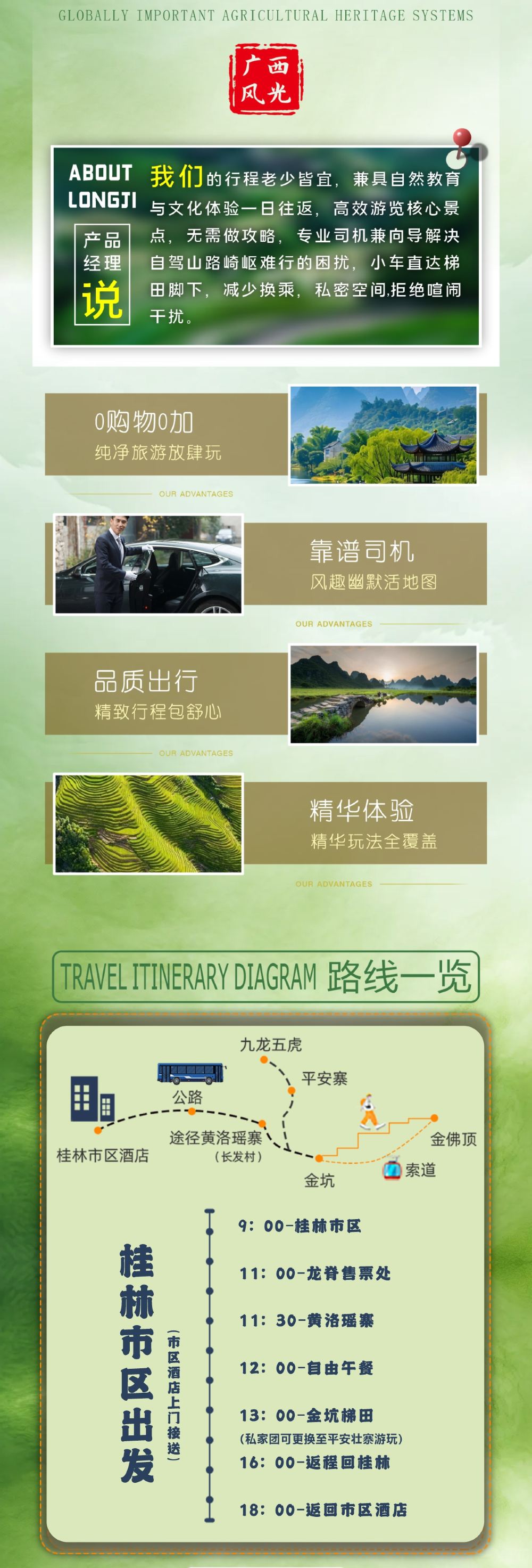 龙脊一日游路线:桂林市区酒店上门接送-龙脊售票处-黄洛瑶寨(长发村)-金坑梯田-金佛顶观景台(索道可以选含或不含套餐)-返回桂林市区