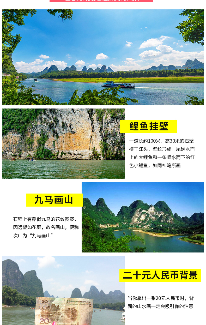 桂林漓江风景区+漓江三星级游船+二十元人民币背景图+漓江精华游+九马画山一日游【漓江四星豪华游船可选】