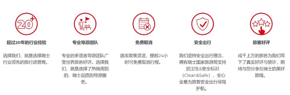作为瑞士德语区行业领先的旅行运营商,我们全心全意提供高品质的旅行服务,专业的多语种导游团队认真负责,得到国际旅客的高度认可。