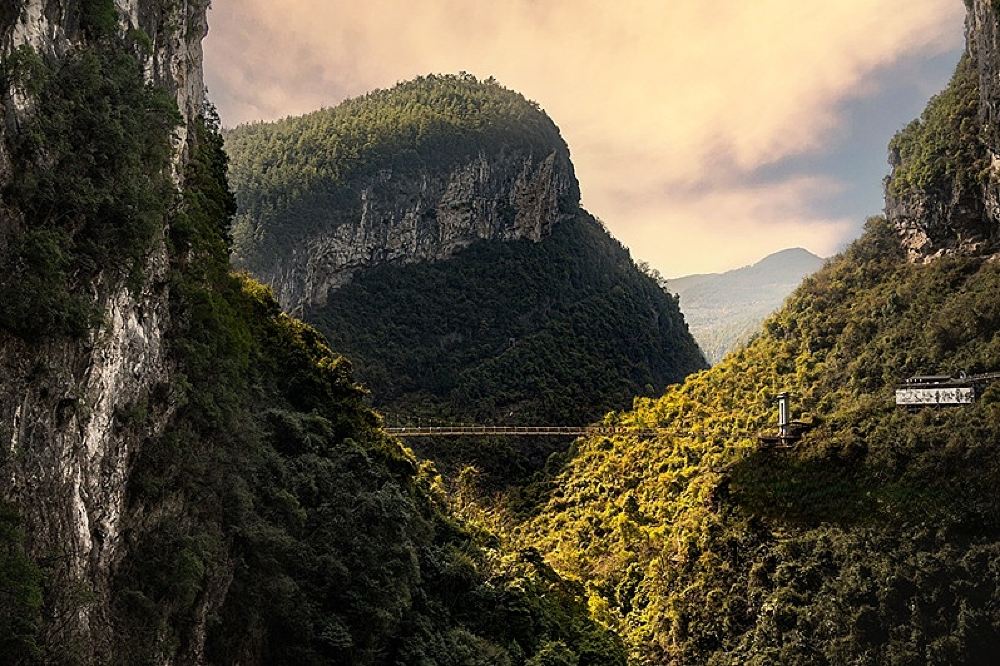 到达游客中心后,我们师傅会取好门票交于客人手中,一进景区便可见一座9D玻璃桥,游客可以根据自身需要选择是否走玻璃桥90每人可选择性需要,如不走玻璃桥可走桥下栈道开始游玩。