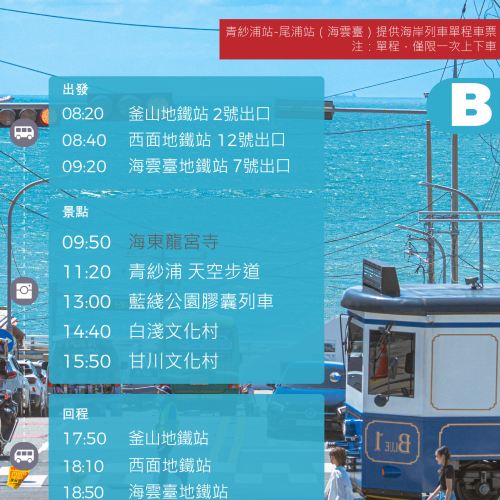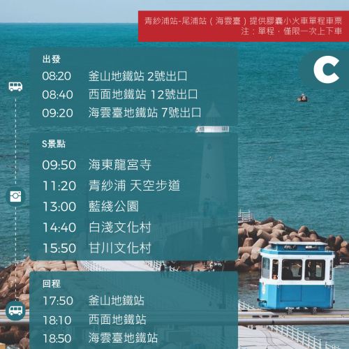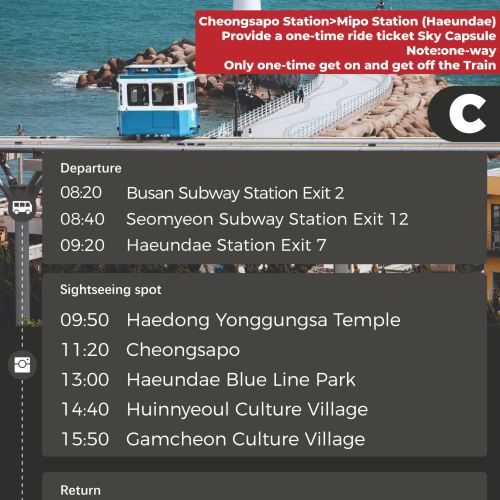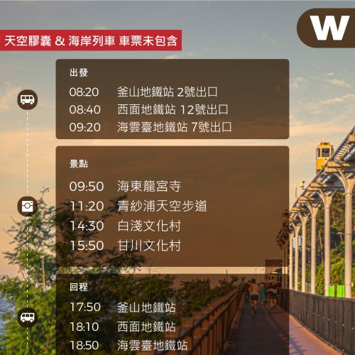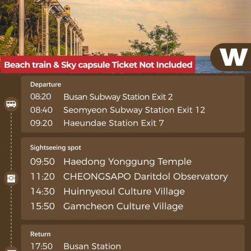 釜山一日深度游,畅游这座融合现代与传统的海滨城市。行程涵盖 海云台蓝线公园 的浪漫海景列车、色彩缤纷的 甘川文化村、风光旖旎的 青沙浦 及庄严壮观的 龙宫寺。全程舒适用车接送,无需自行换乘交通,让您轻松畅玩釜山知名景点,一天尽享大海、文化与美景,拍下今天完美的照片吧。另外,可通过使用釜山旅游通行证,获得令人惊叹的优惠。