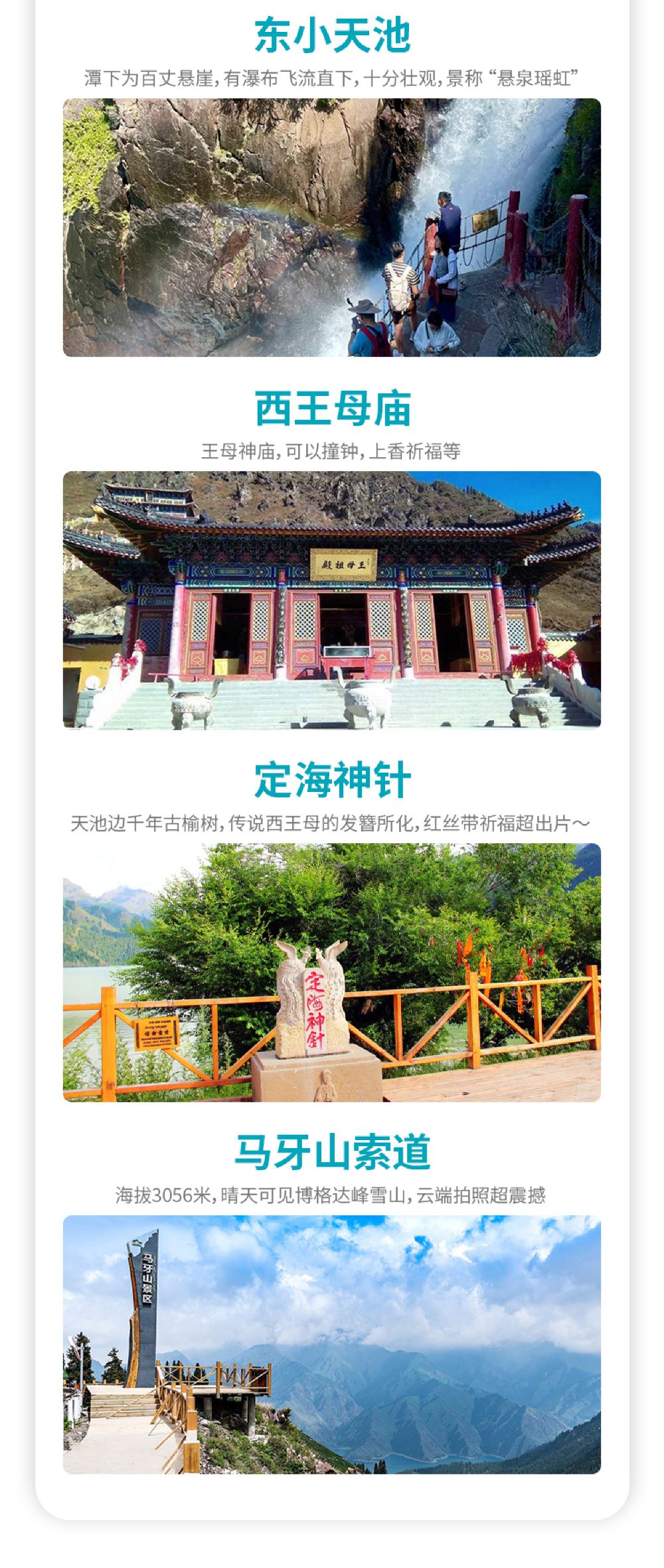 :景区内有西王母祖庙、铁瓦寺、博克达山庙等历史遗迹。西王母祖庙位于天池东岸,坐北朝南,庙内供奉着汉白玉和紫檀木雕刻的西王母神像。铁瓦寺是道教全真派首领长春真人邱处机亲率弟子修建的,因青砖砌墙、铁瓦铺顶而得名。