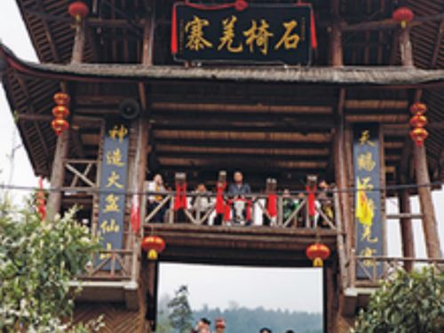▲ 白云朵朵,古老的羌寨 碉楼高高,耸入云端 羊角花盛开的地方 是尔玛人幸福的家园 羌红飘扬,沙朗翩翩
