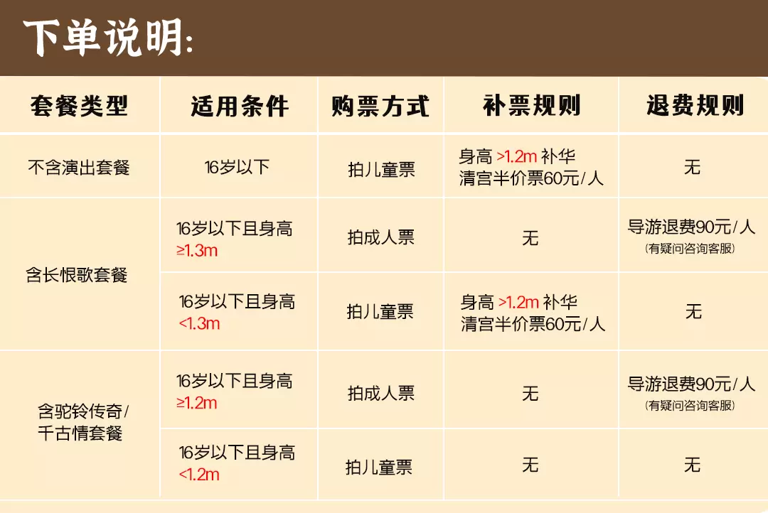 4、长恨歌、驼铃传奇、千古情每名家长限带一名免票儿童(免票无座),如遇大风、大雨、地震等不可抗力因素,景区可免责终止演出(以景区当天通知为准)