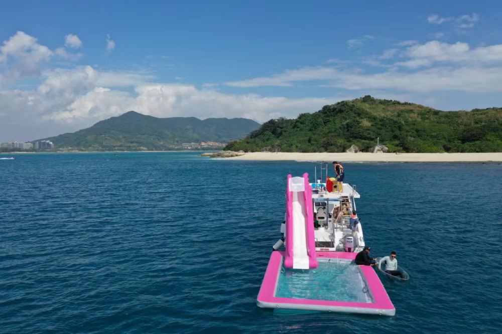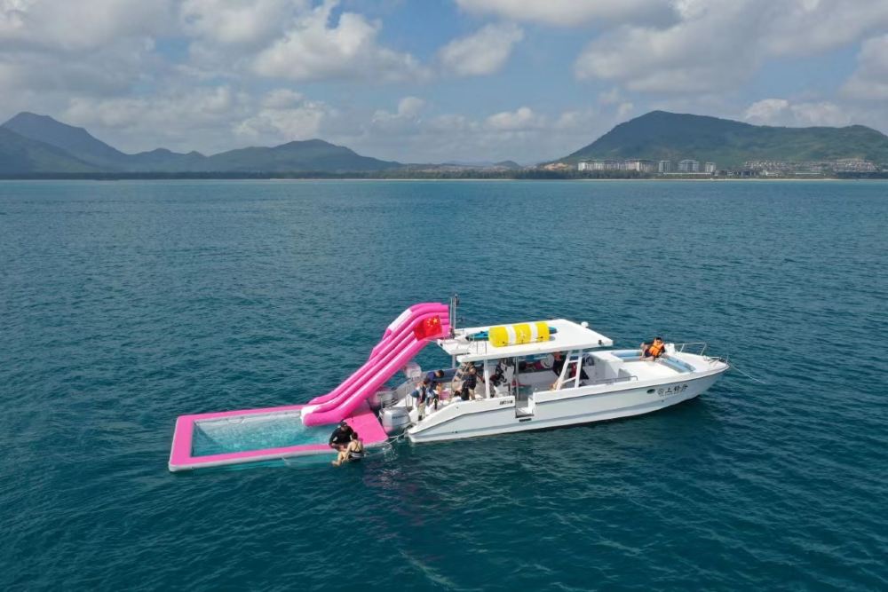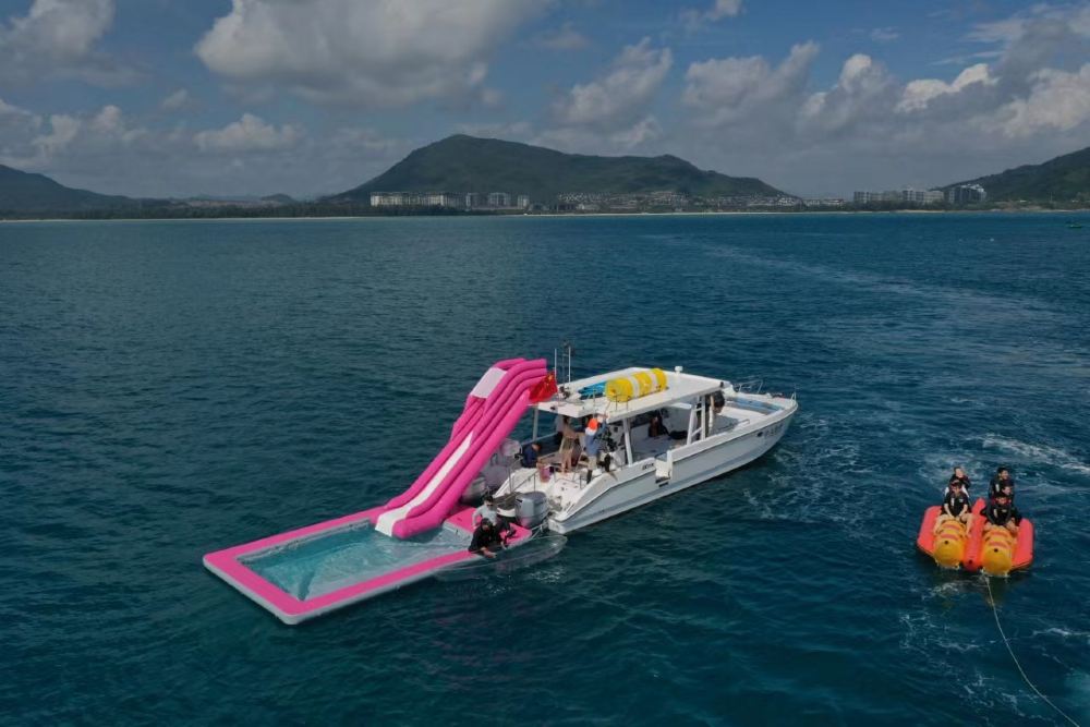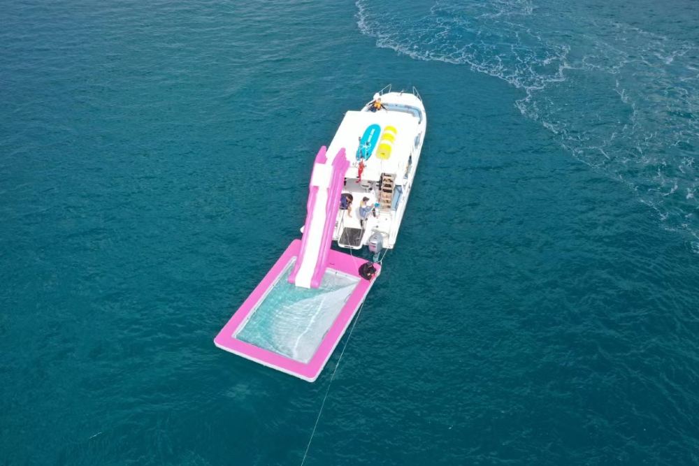 包含娱乐:游艇自驾体验、自由浮潜、浮潜跟拍,免费提供浮潜装备、海上浮毯,海上滑梯,游泳池,海钓,摩托艇,香蕉船体验,领队服务,跟拍航拍玻璃船,一次性咬嘴、船内客厅(带空调)、救生衣,自驾前码头集合
