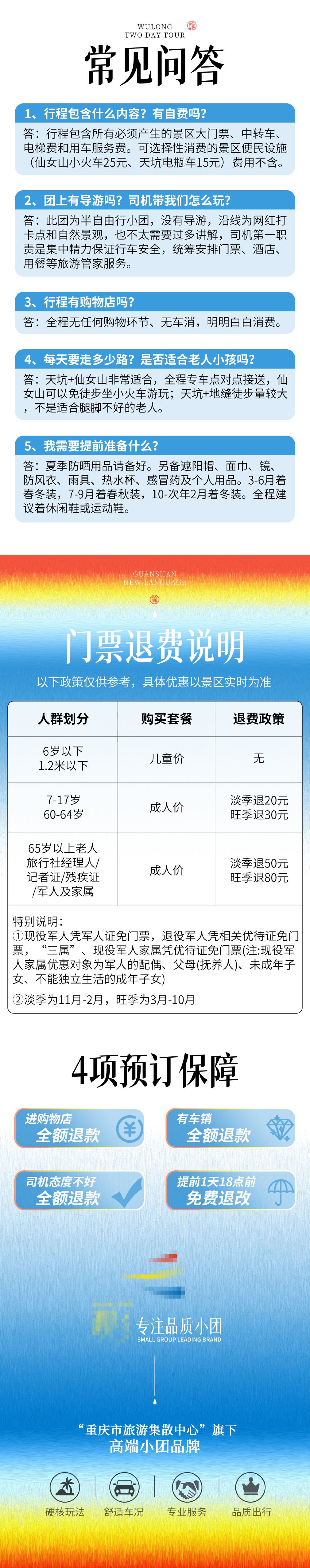 1、节假日、黄金周期间由于游客量大,为保证游客安全,武隆景区会开通应急通道入口(一号入口和二号入口)进行客源分流进入景区,请知悉!