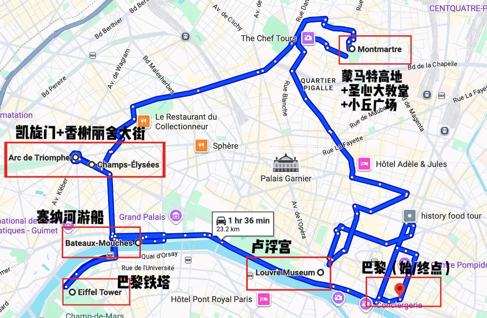 ▲ 30s get 巴黎市区景点位置。此路线为套餐预览,巴黎市区景点景点众多,若有特定路线或想多停留几日,可联系定制师确定包车细节。