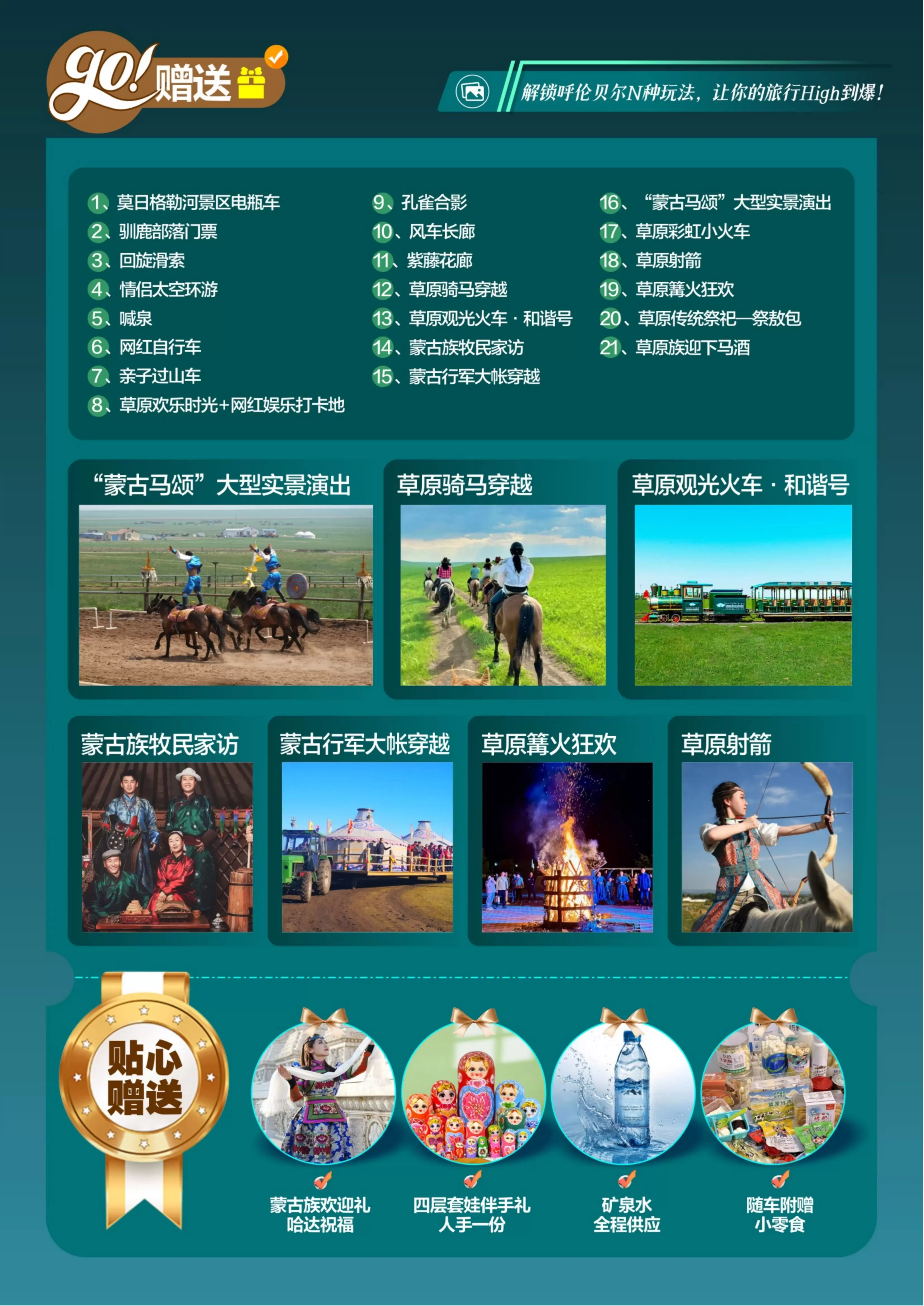 超值赠送:1、莫日格勒河景区电瓶车2、驯鹿部落门票3、回旋滑索4、情侣太空环游5、喊泉6、网红自行车7、亲子过山车8、孔雀合影9、风车长廊10、紫藤花廊11、草原骑马穿越12、草原观光火车·和谐号13、草原欢乐时光+网红娱乐打卡地14、蒙古族牧民家访15、蒙古行军大帐穿越16、“蒙古马颂”大型实景演出17、草原彩虹小火车18、草原射箭19、草原篝火狂欢20、随车附赠零食21、草原传统祭祀—祭敖包22、草原族迎下马酒23、蒙古族欢迎礼—哈达祝福24、矿泉水全程供应25、四层套娃伴手礼人手一份26、旅行社责任保险