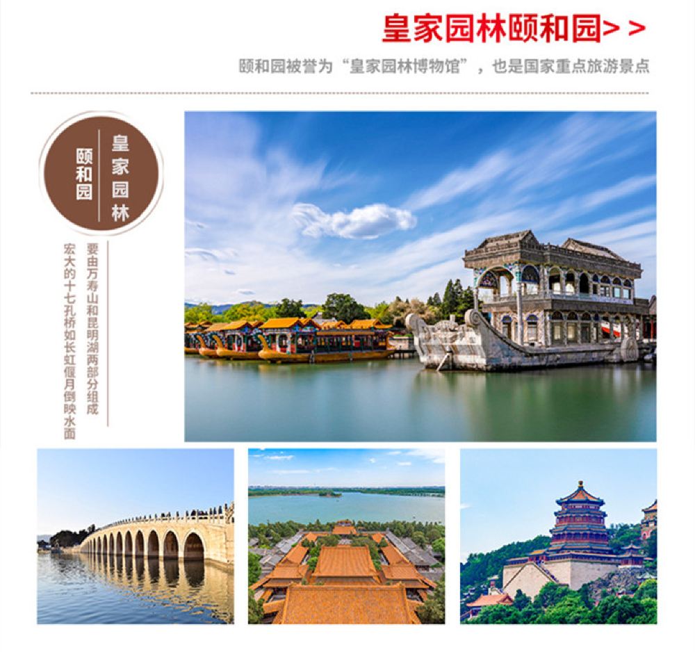 颐和园原是清朝帝王的行宫和花园,又称清漪园,以昆明湖、万寿山为基址,按照江南园林的设计手法建造,是我国现存规模非常大,保存非常完整的皇家园林,景色极具优雅,还有很多珍贵的文物,为“家园林博物馆”。区域概览颐和园规模宏大,全园可分3个区域:以仁寿殿为中心的政治活动区;以玉澜堂、乐寿堂为主体的帝后生活区;以长廊沿线、后山、西区为主的苑园游览区。整个园区约四分之三为昆明湖所占据,湖畔有亭、台、楼、阁、廊、榭等建筑物百余座三千余间,其中佛香阁、长廊、石舫、苏州街、十七孔桥等皆为家喻户晓的代表性建筑,也是游览颐和园不可错过的地方。泛舟昆明湖游览颐和园,除了参观金碧辉煌的殿堂建筑,乘坐景区内的游船,泛舟昆明湖上,既轻松惬意,又不误观光赏景。园内有游船码头8个:八方亭、文昌阁、玉澜堂、排云殿、石丈亭、铜牛、石舫和南湖岛,5种不同类型的游船:脚踏船、手划船、电瓶船、龙船和大型画舫。游船价格路线各异,可各取所需。园内餐饮颐和园面积较大,完整的游览完至少要4-5个小时。逛得累了饿了,可以坐下来补充下能量。园内共有三个快餐亭,分别位于知春亭、排云殿东九间和石丈亭处,主要经营日常饭菜和面食,价格相对来说还算公道。如果想要应景儿,园内还有一处专营宫廷御膳的传统饭庄:听鹂馆,在那里可以品尝到具有宫廷风味的食物,不过价格就比日常菜贵一些了。