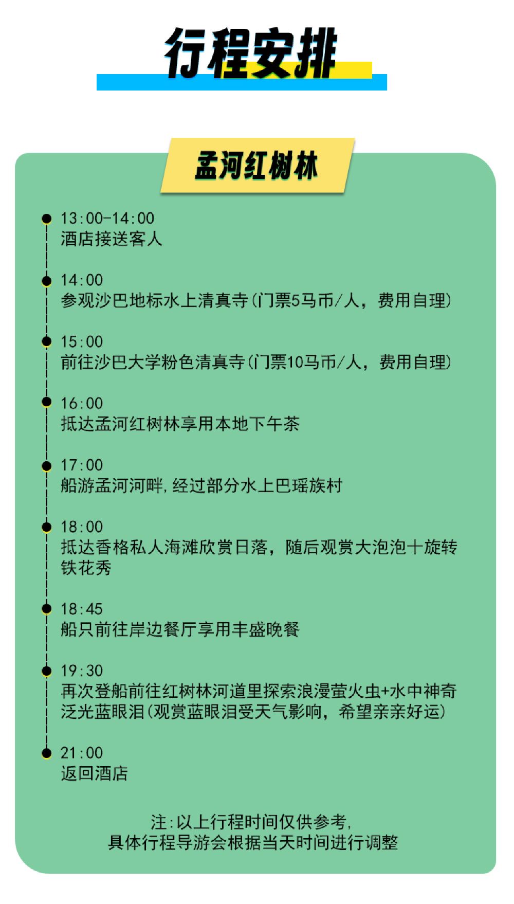 沙巴亚庇孟河红树林蓝眼泪萤火虫打铁花沙滩泡泡网红浮台一日游【享⽤香甜的椰子布丁及下午茶,登上⽹红浮台拍照打卡】
