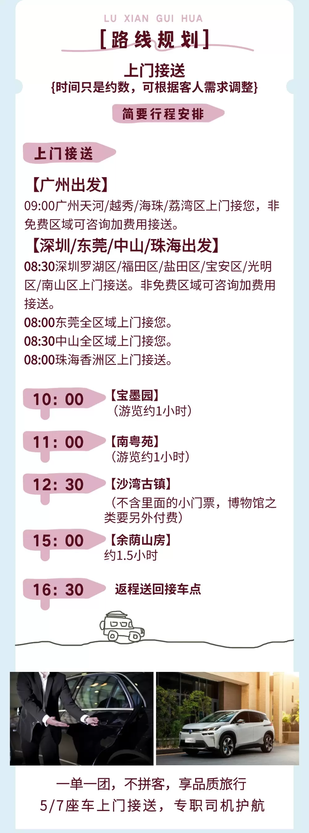 品质服务:5座/7座车上门接送,专职司机护航